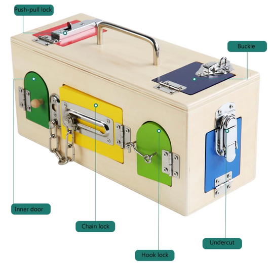 Montessori fa zárdoboz – Busy Board zárakkal és ajtókkal