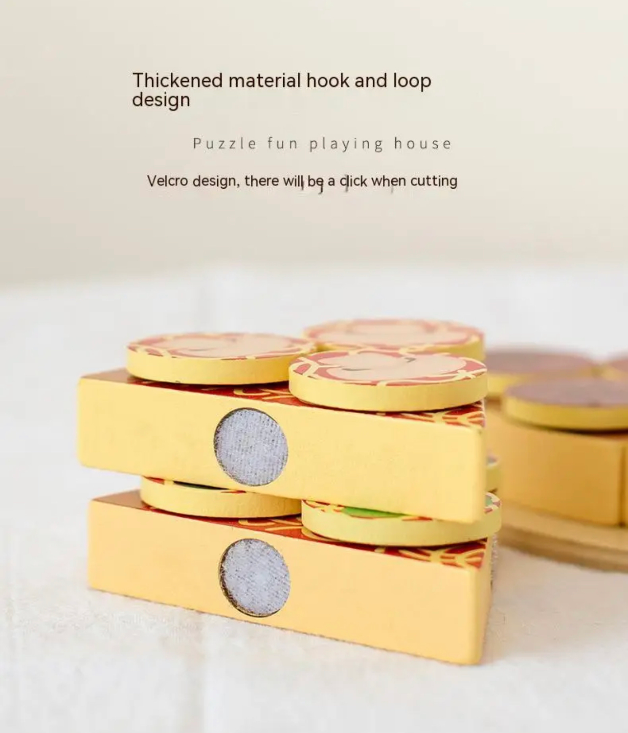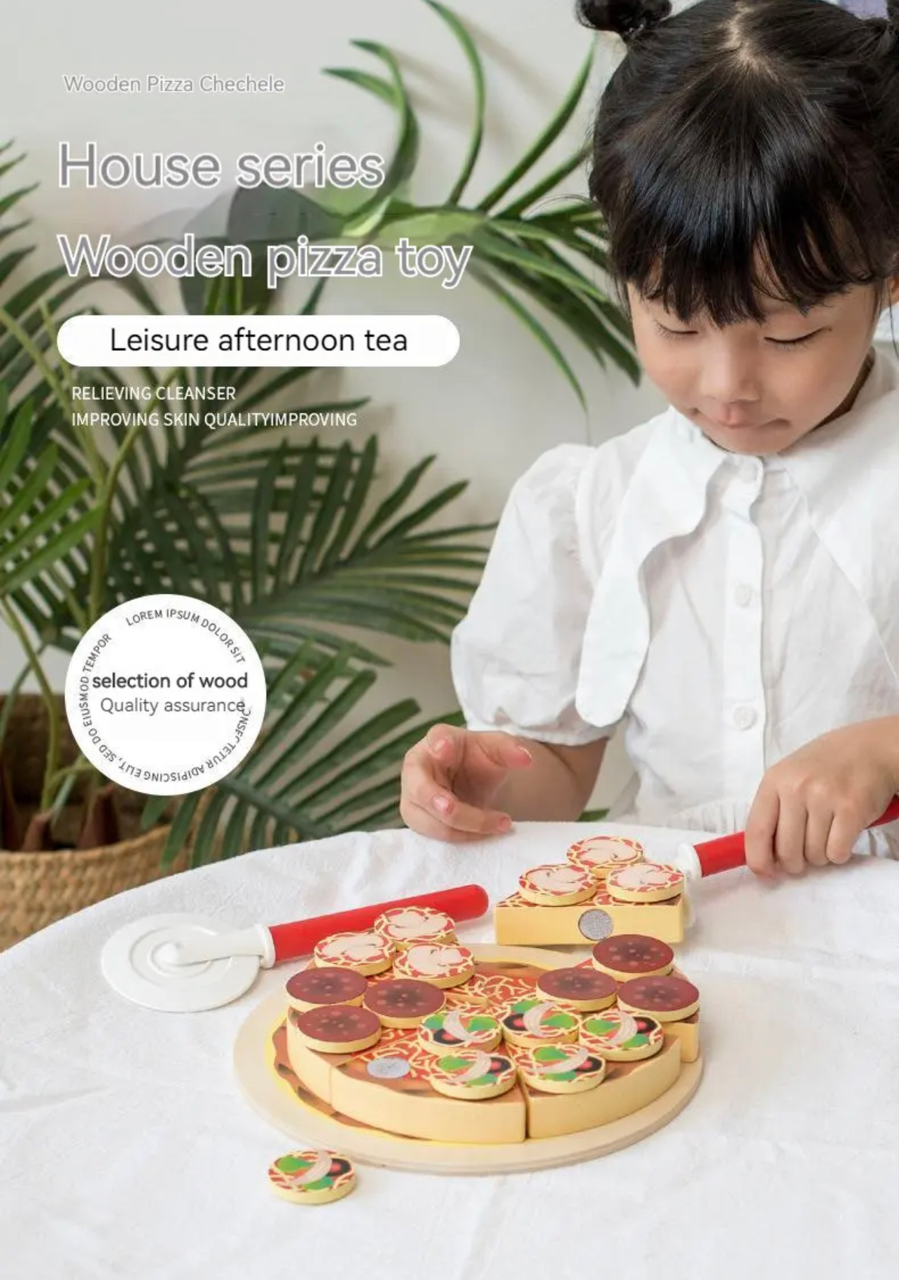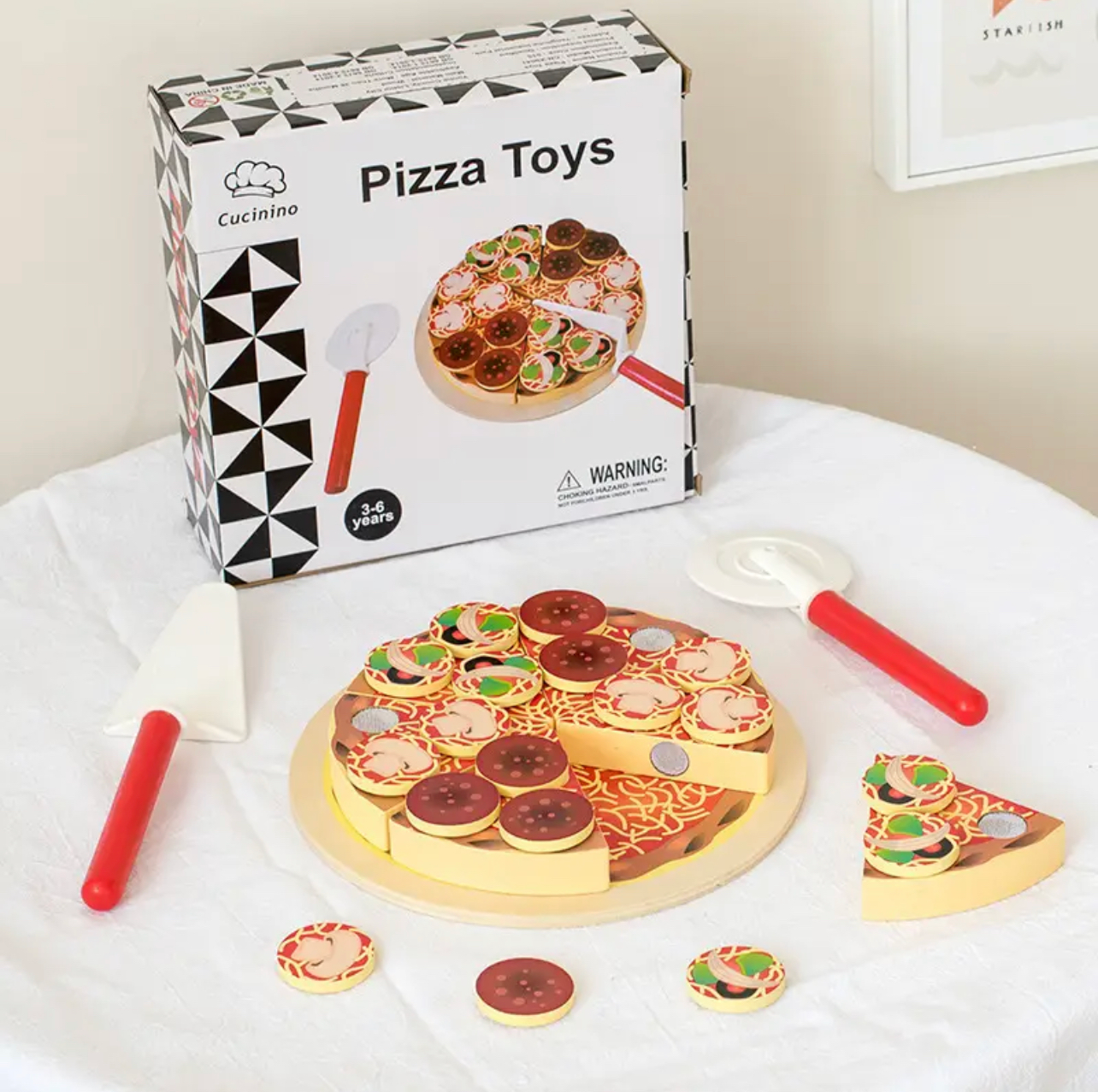 6 szeletes szeletelhető pizza tálcával, pizzakanállal, pizzakéssel és különböző feltétekkel. A szeletek és feltétek tépőzárral rögzíthetők. A tálca átmérője 19,5 cm a pizzaé pedig 16,5 cm.