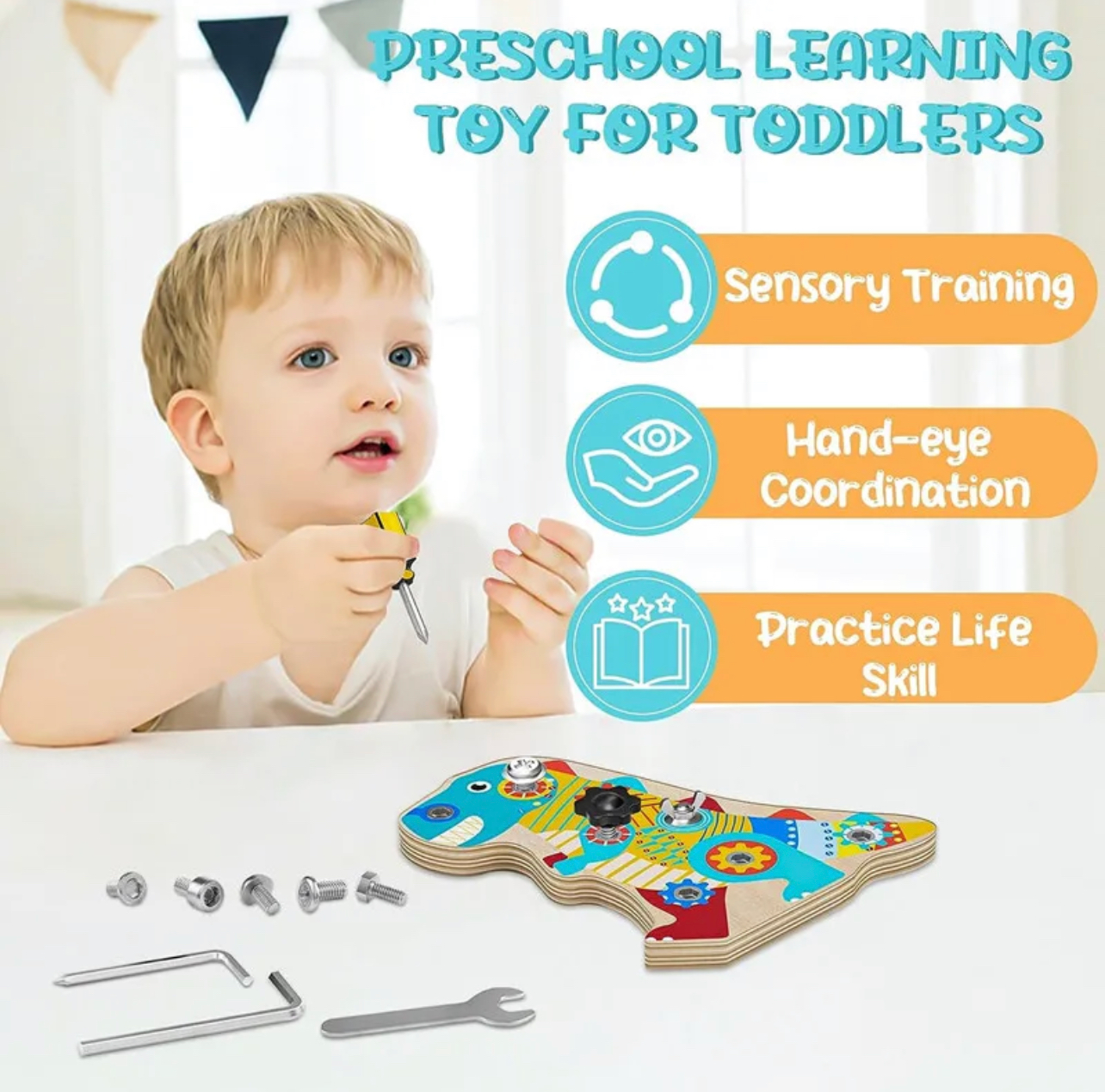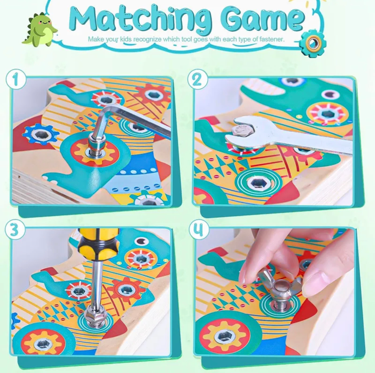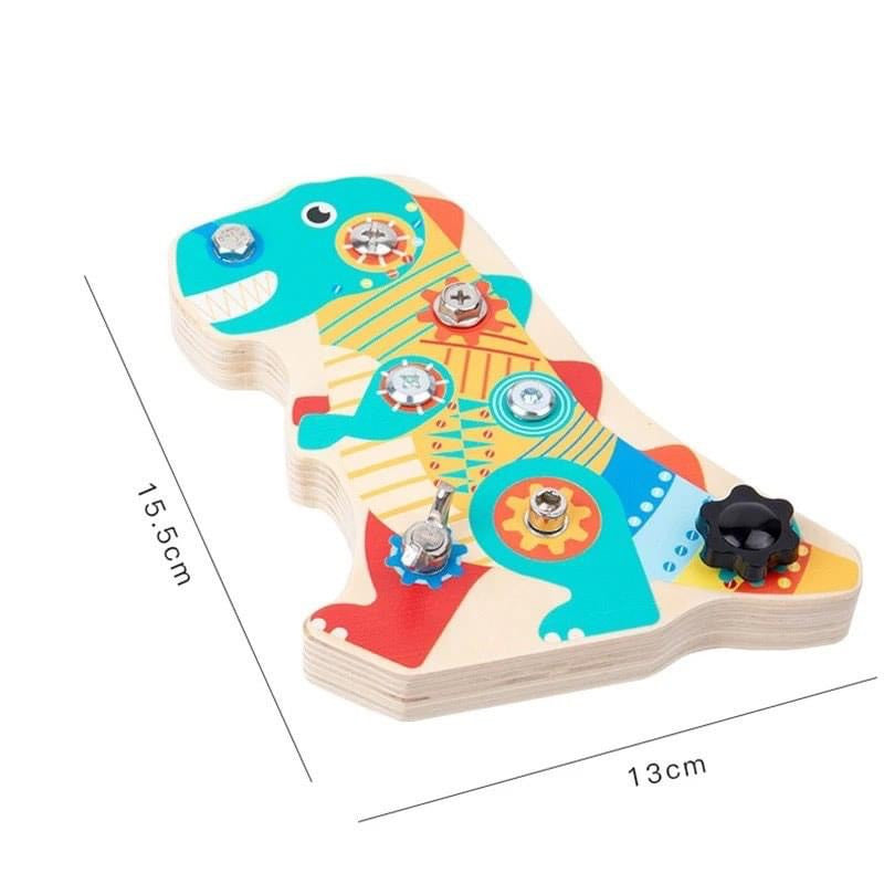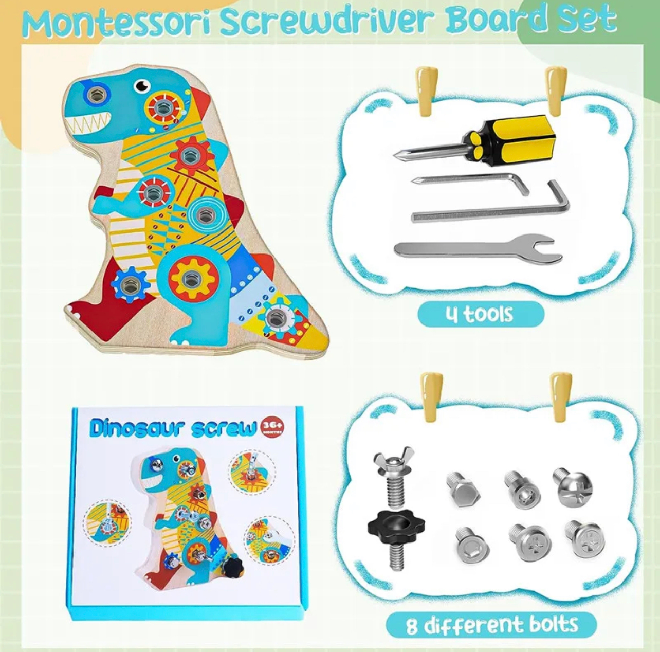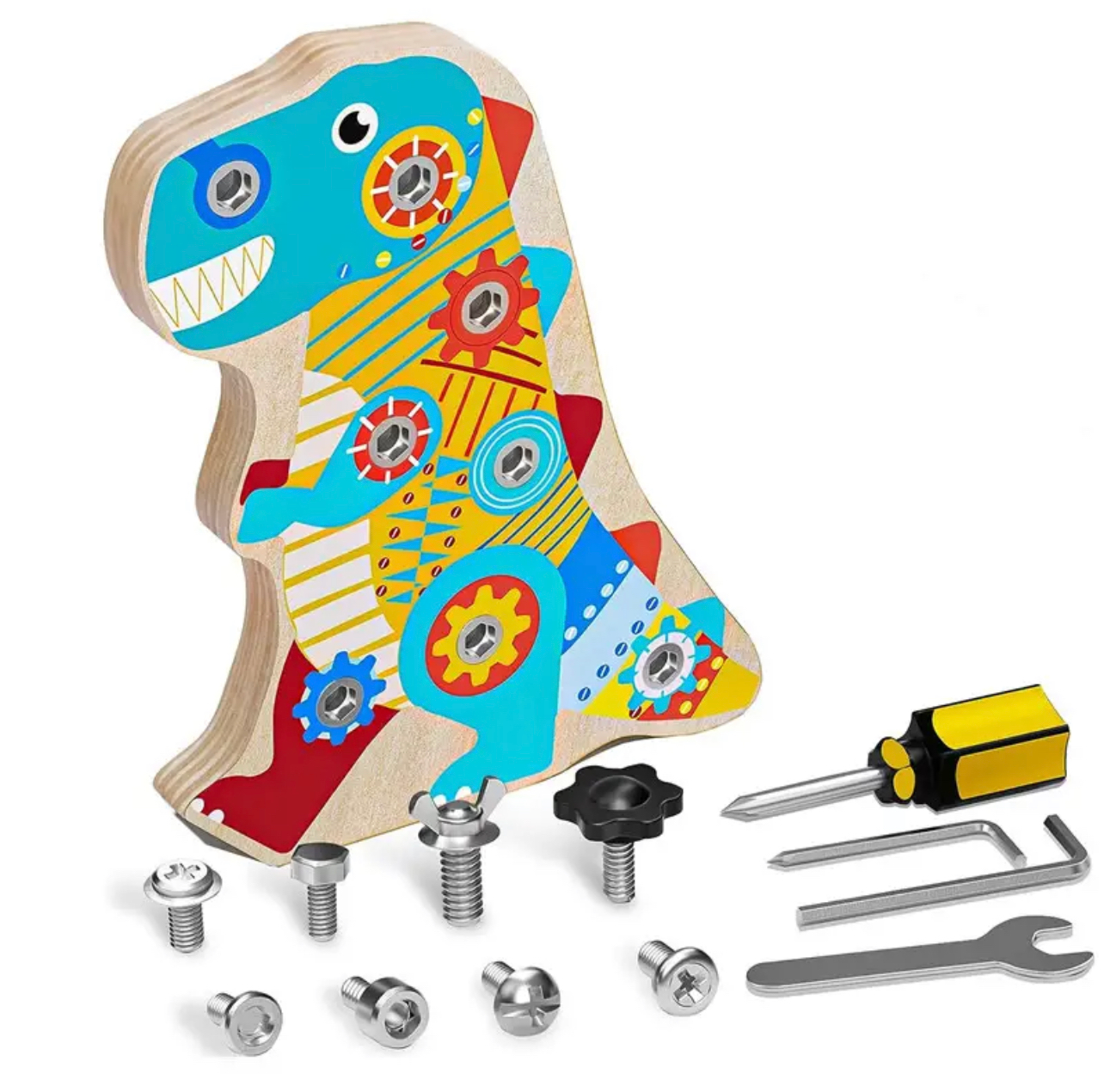 Dinó formájú csavarozós játék. 4 különböző csavarhúzóval és 8 különböző csavarral. Fejleszti a kézügyességet, finommotorikát és a koncentrációt. Mérete 23*15,5 cm.