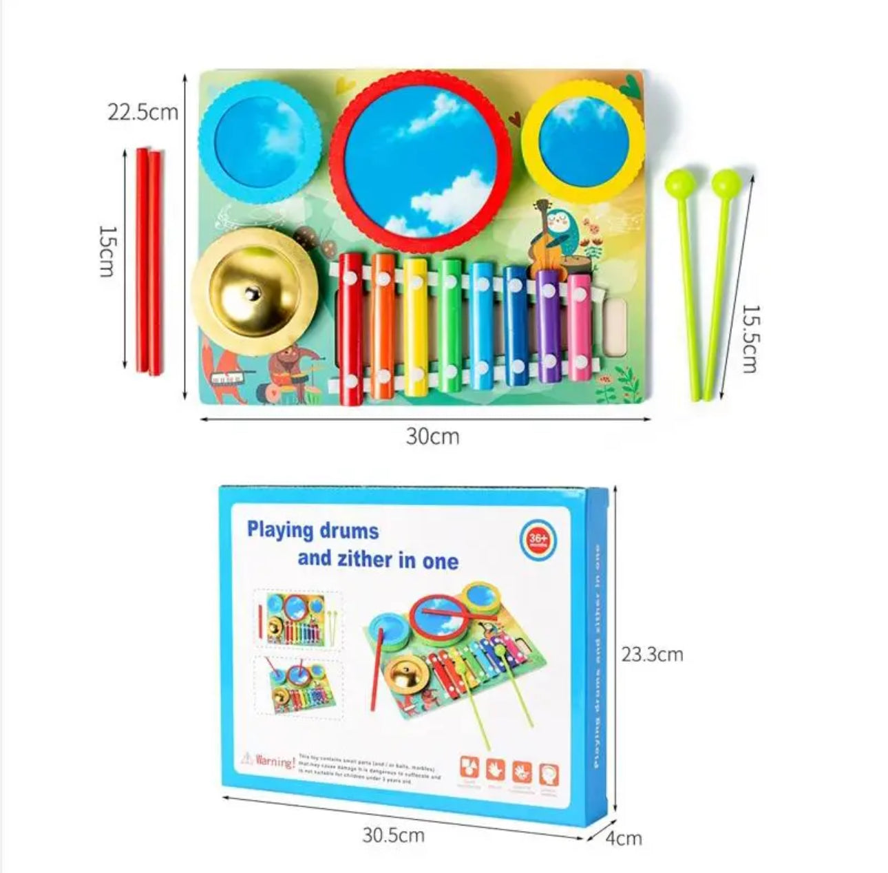 A játék kiváló minőségű fából készült, biztonságos, környezetbarát festéssel. A készlet tartalmaz 3 dobot, 1 cintányért és egy 8 hangú xilofont, valamint verőpálcákat és ütőket a változatos játékhoz. Otthoni és útközbeni használatra egyaránt ideális, interaktív játékhoz, csoportos tevékenységekhez vagy korai zenei neveléshez.