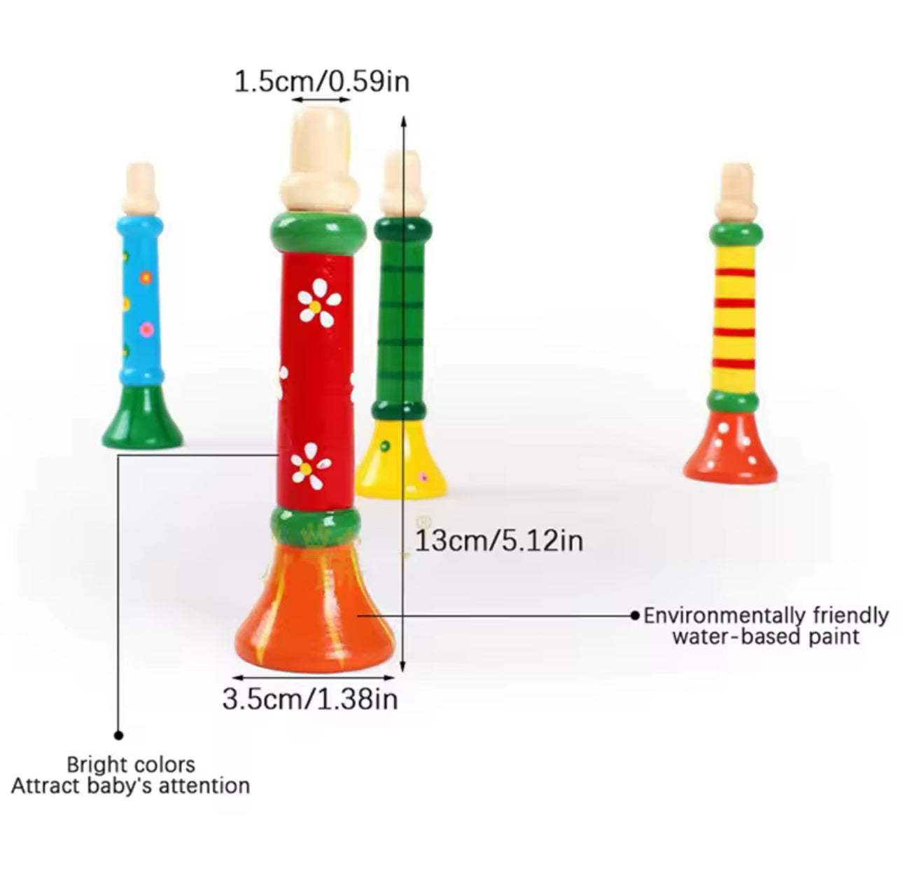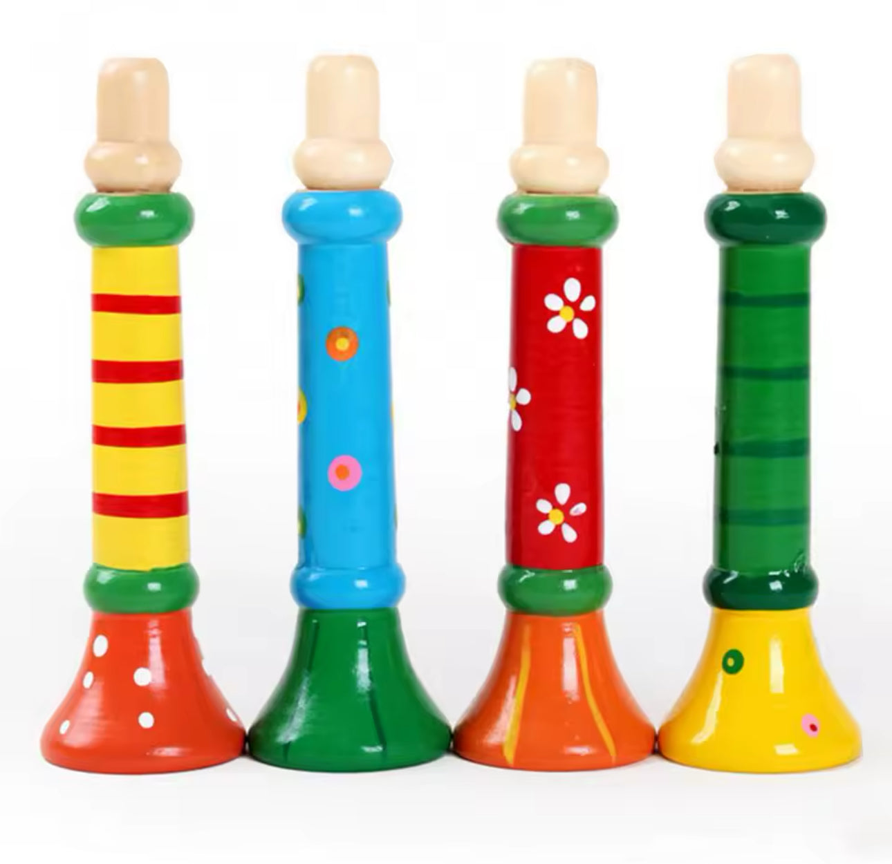 Hangoskodjunk! Ezek a gyönyörűen festett fából készült trombiták nem csak nézni szépek, hanem zenéléshez és a gyerekszoba színpadi nagykoncertjéhez is kiválóak. A trombiták jól illeszkednek a kézbe, és sok szórakoztató hangot adnak ki kisebb és nagyobb gyermekek számára egyaránt.