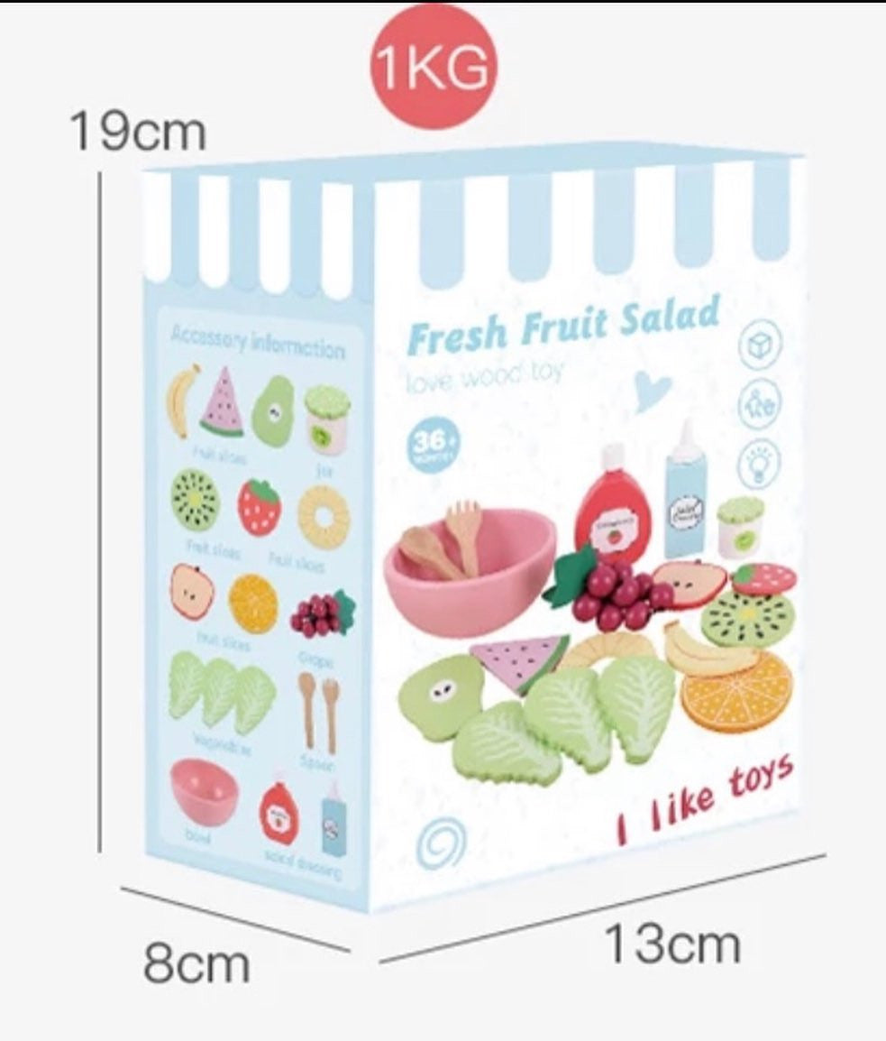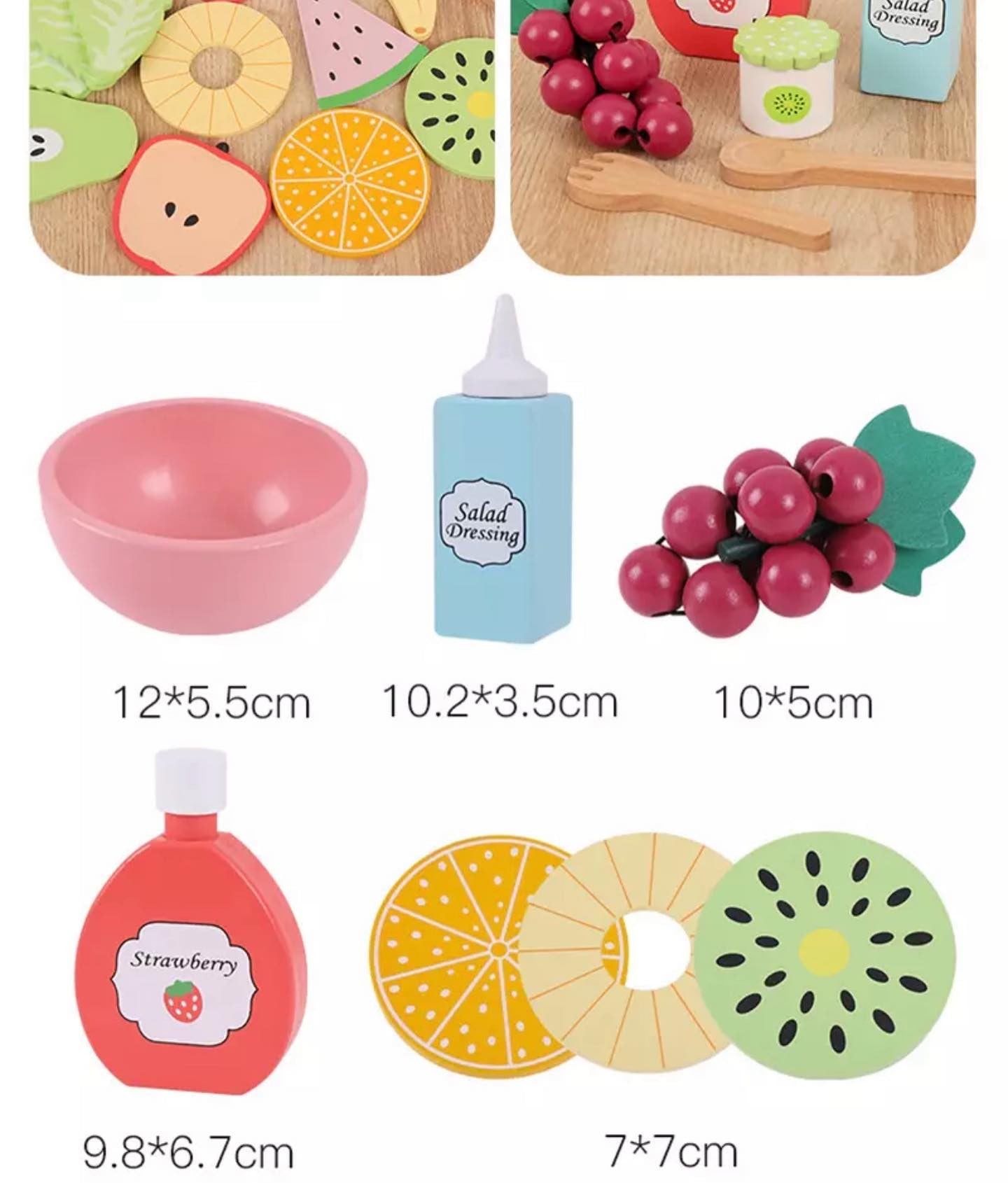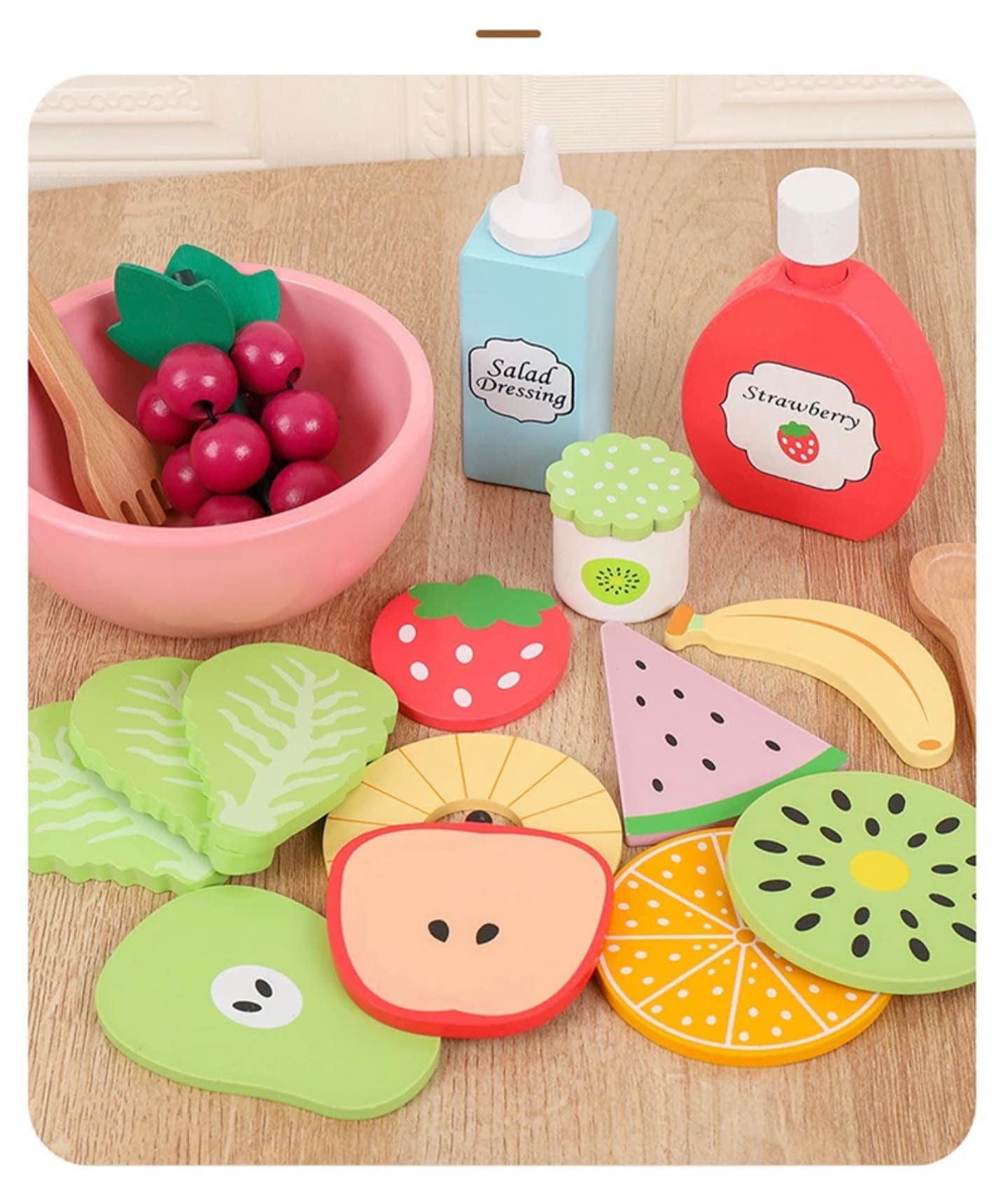 Keverd össze az összes gyümölcsöt az elre a célra szolgáló fa tálban és szervírozd a tejszínhabbal, eperkrémmel és dekor cukorkával. A salátás eszközök segítenek a tálalásban és a keverésben is.