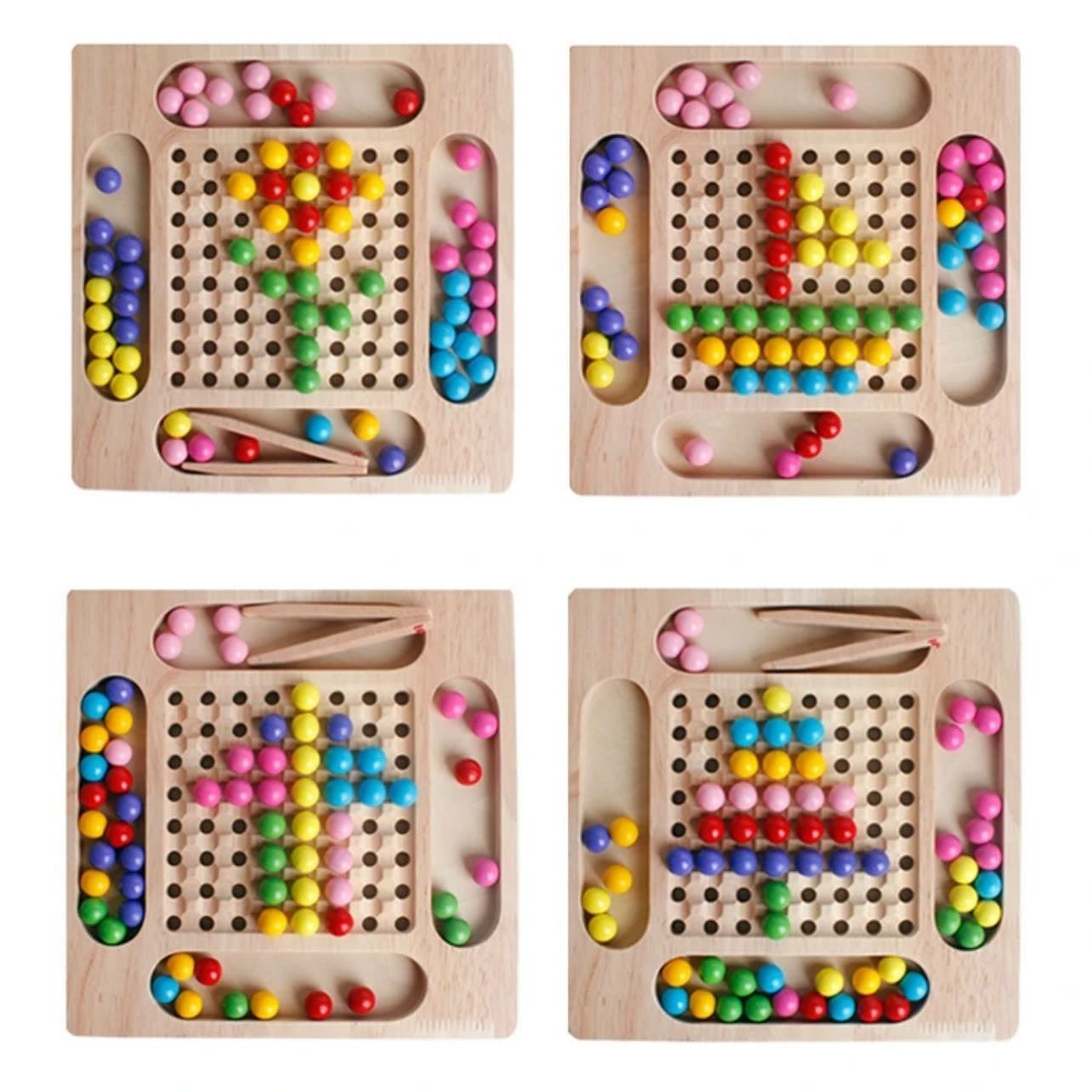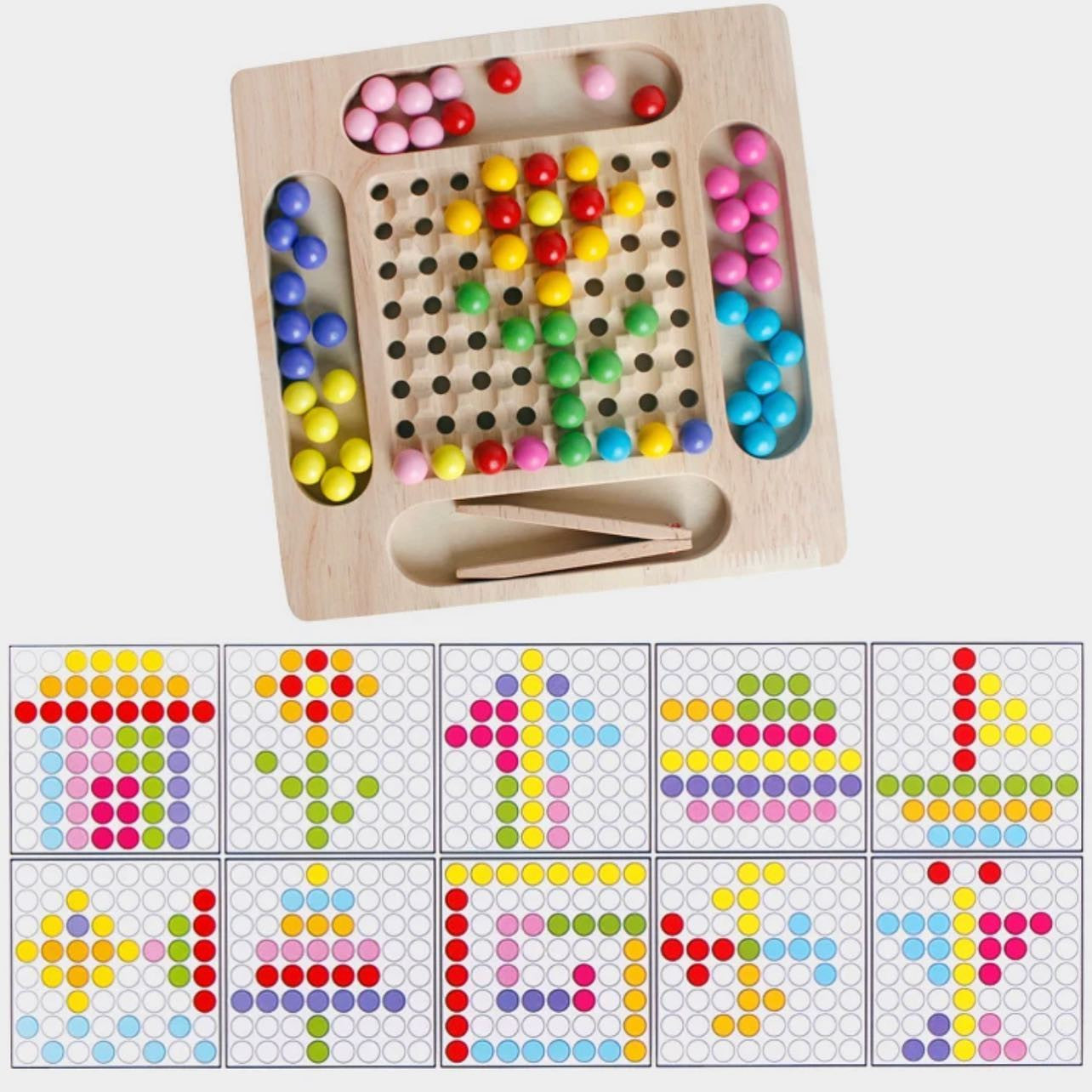 Szabadon, vagy a játékhoz tartozó feladatlapokon lévő mintákat kell kirakniuk a csipesszel a gyerekeknek. Használható színválogatásra is. Segítí a színek elsajátítását, fejleszti a kézügyességet.