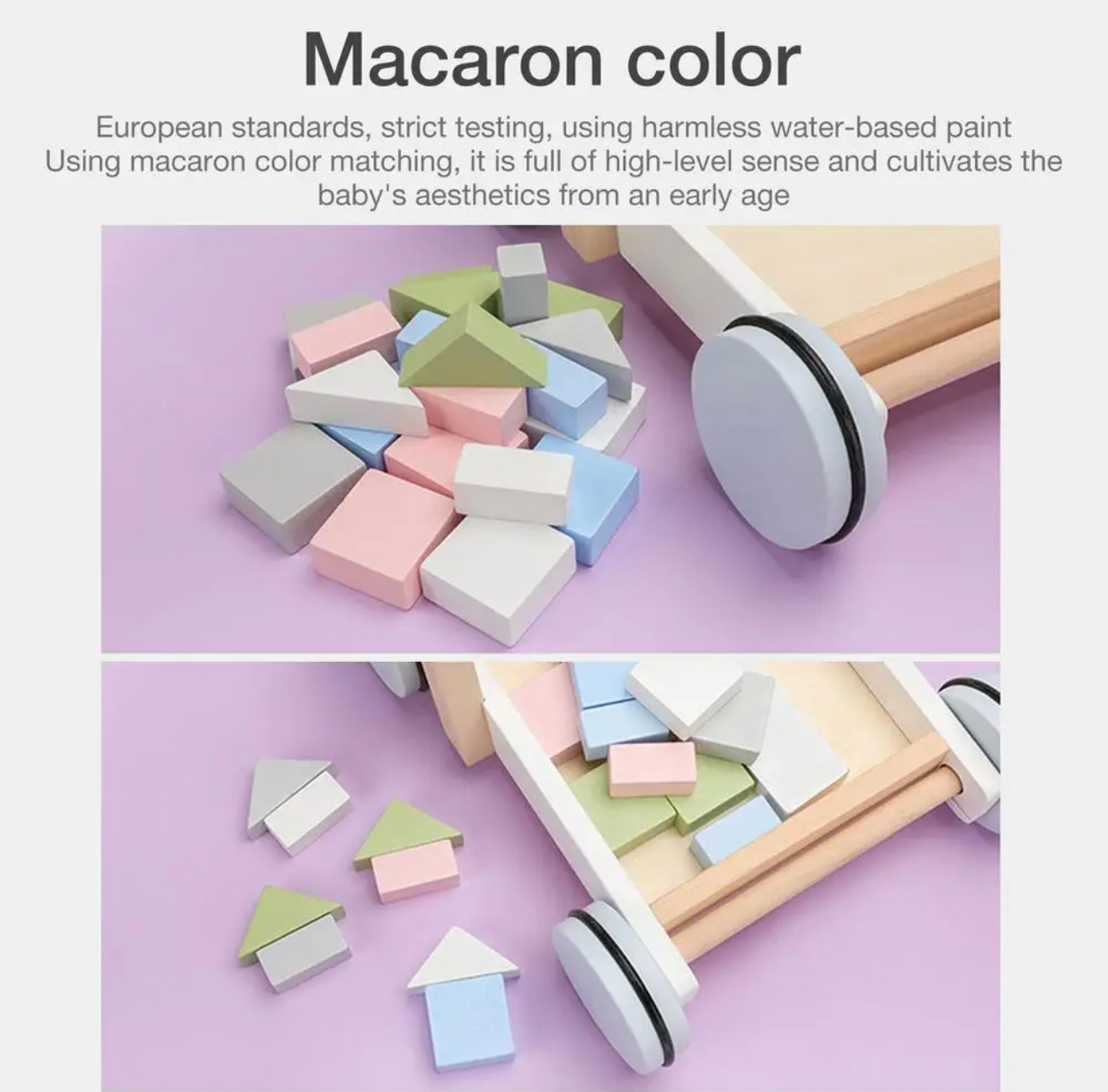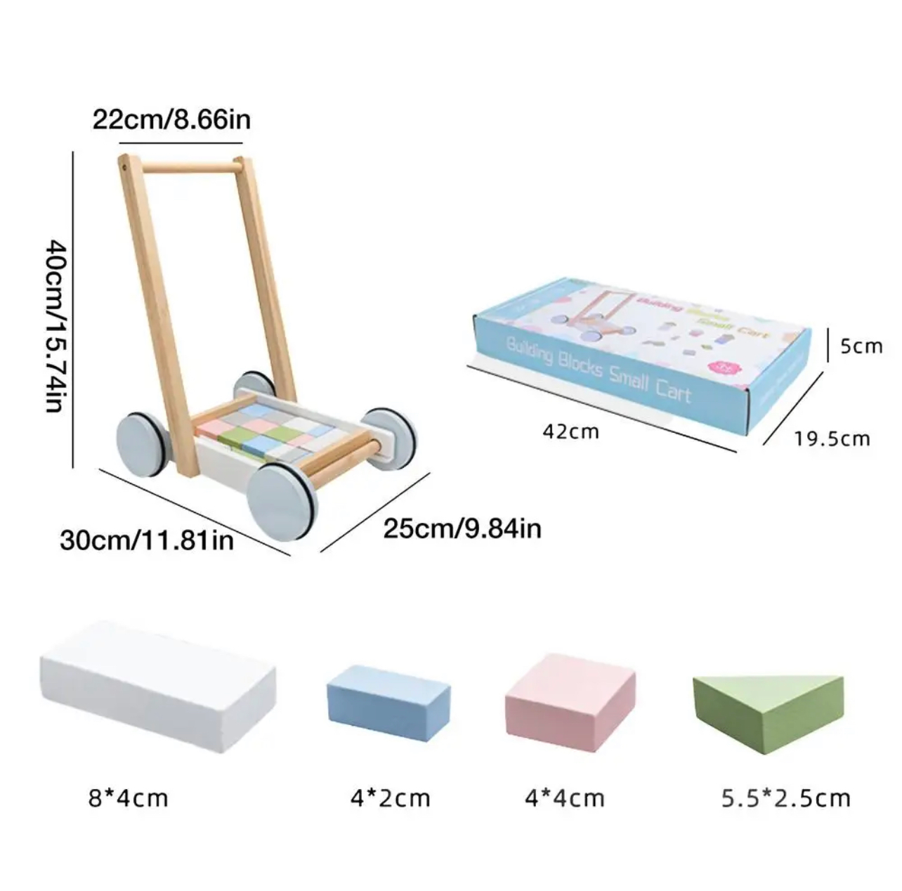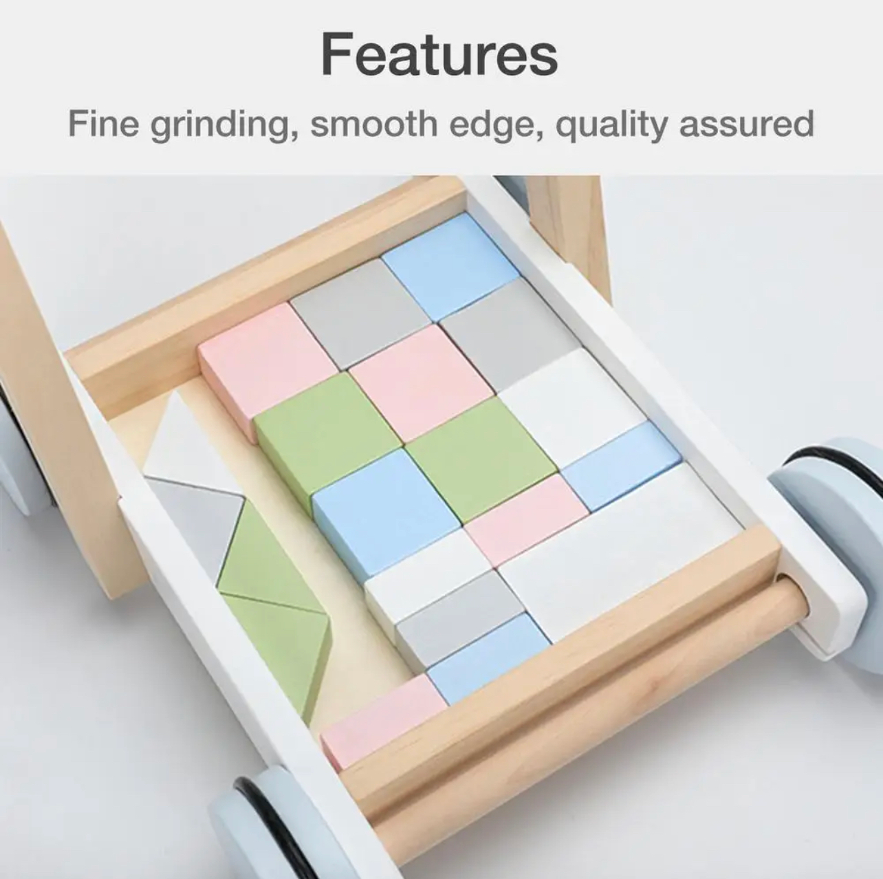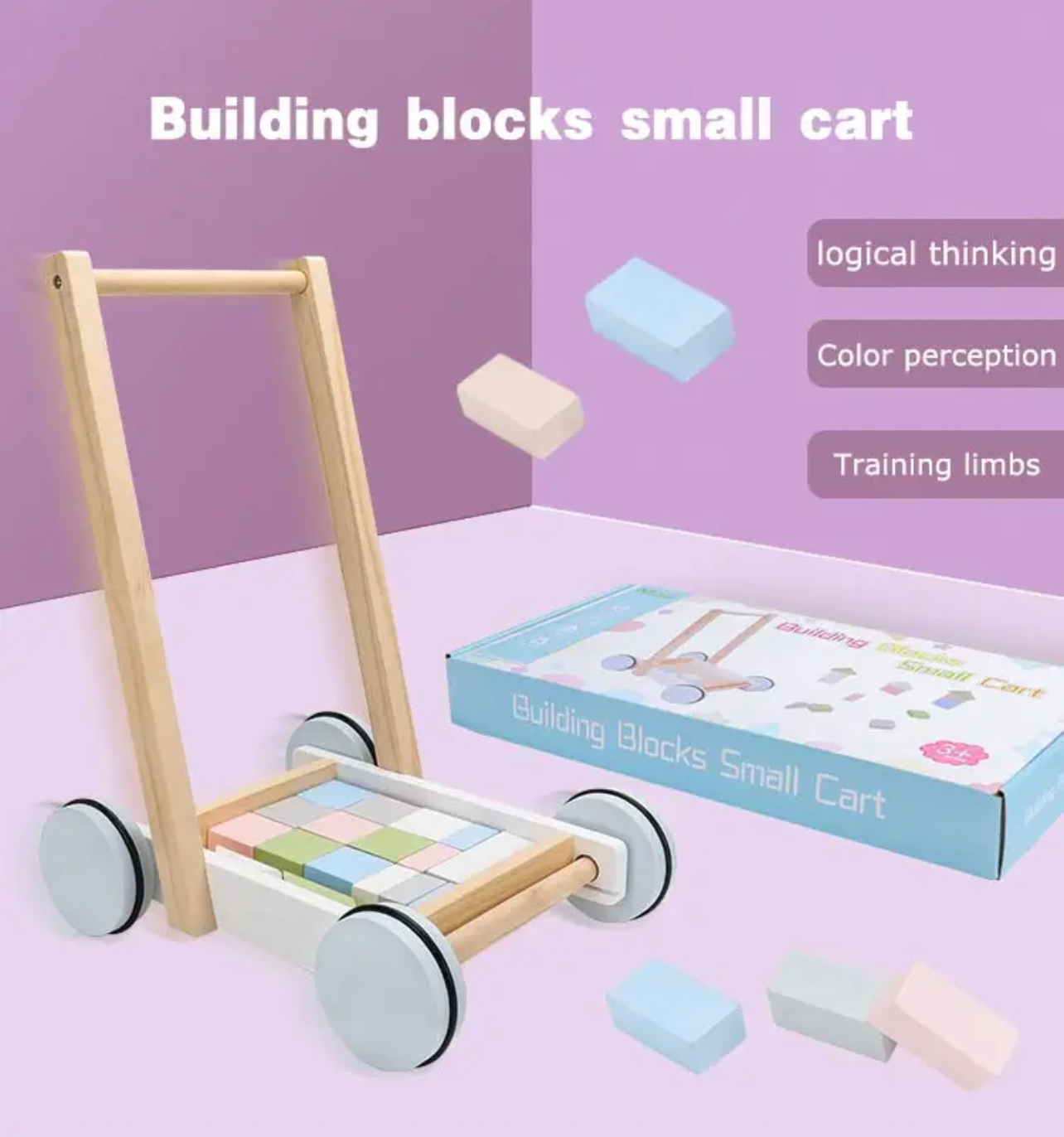 Járássegitő kiskocsi 20 darab epitőkockával. A járás mellett segíti a színek és formák elsajátítását, fejleszti a kézügyességet és a szem kéz koordinációt.