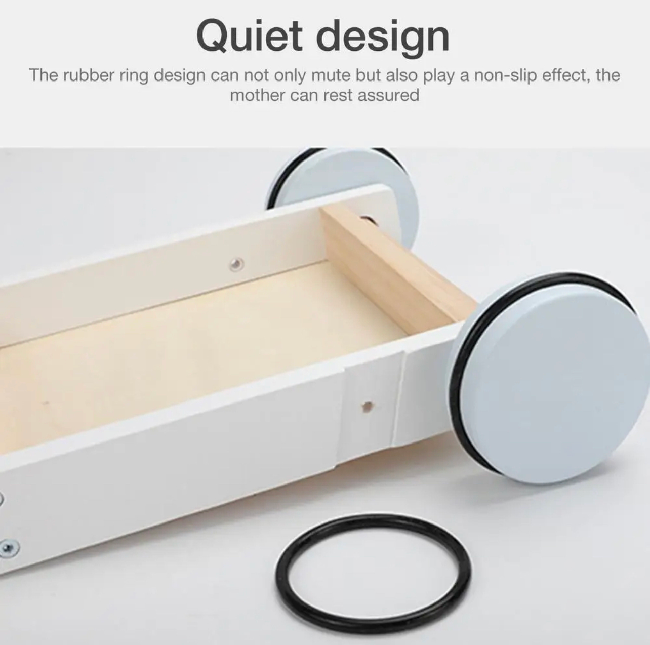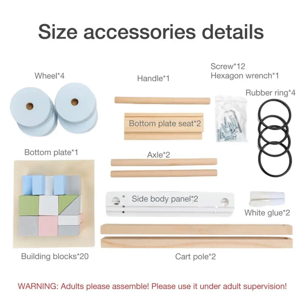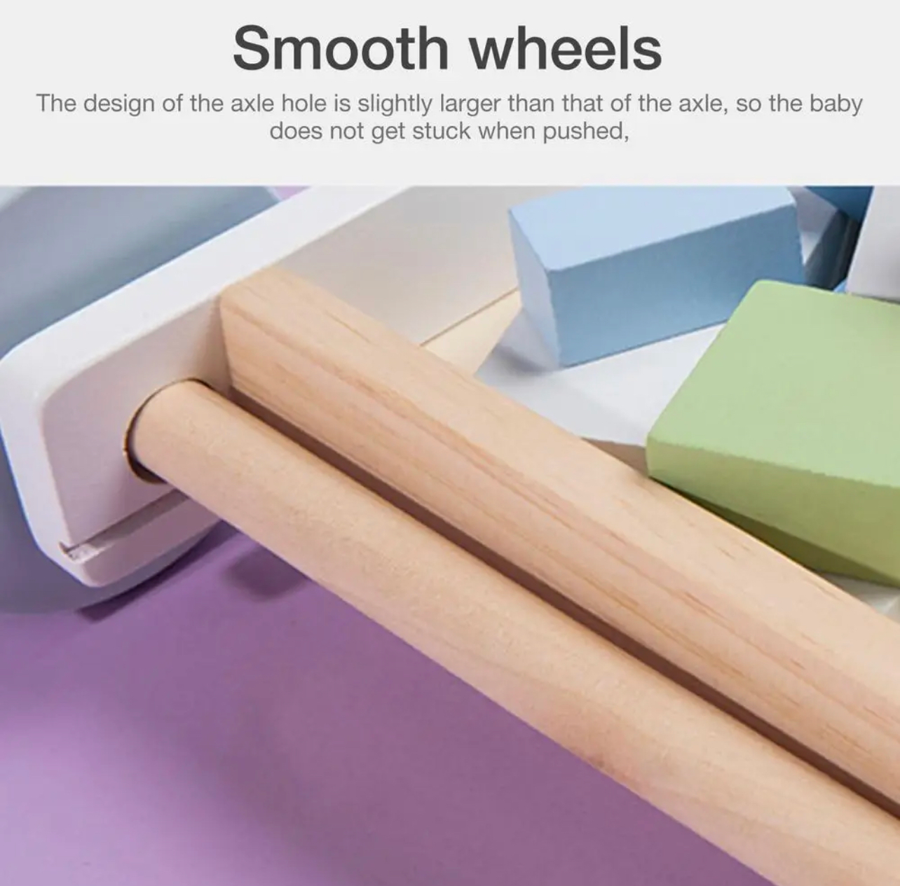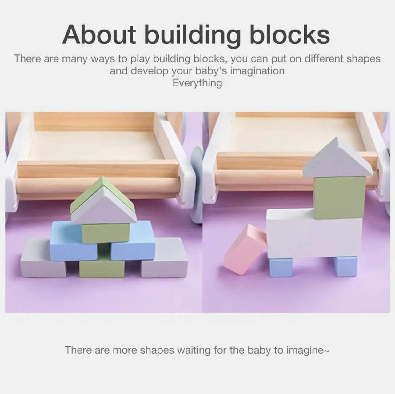 Járássegitő kiskocsi 20 darab epitőkockával. A járás mellett segíti a színek és formák elsajátítását, fejleszti a kézügyességet és a szem kéz koordinációt.