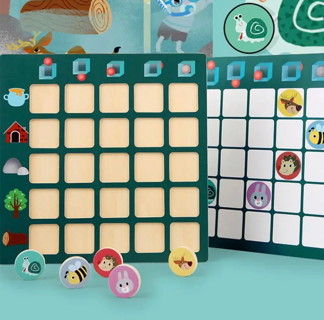 1. Állatok keresése különböző irányokban: egy játéktábla, öt állat kerek faforgács, 20 játék kétoldalas kartonpapír, találja meg a képen látható öt különböző tárgynak megfelelő öt állat helyzetét.