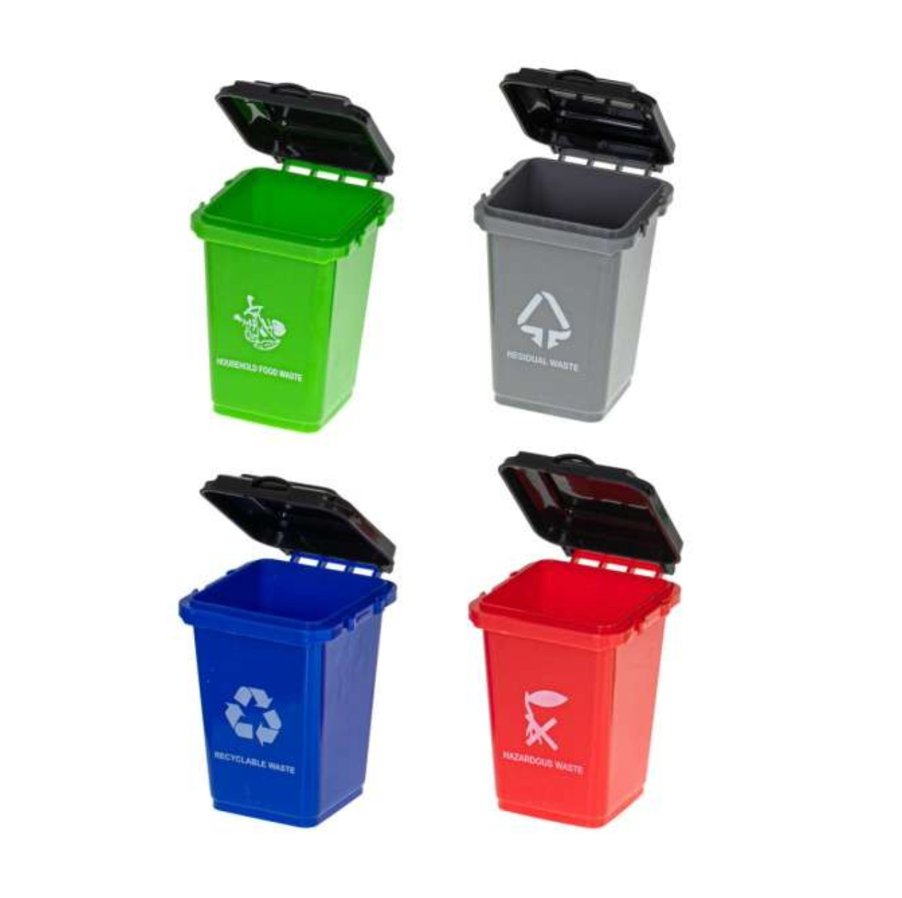 V1: 4 színes kukát (piros, zöld, kék, szürke) és 112 angol feliratú termékkártyát.