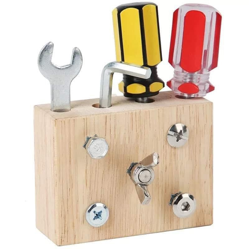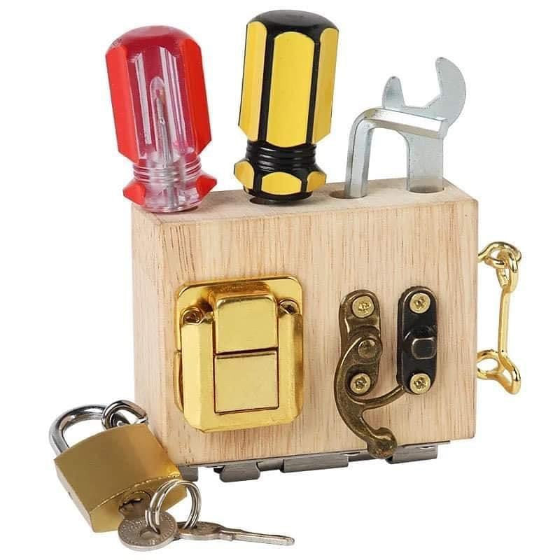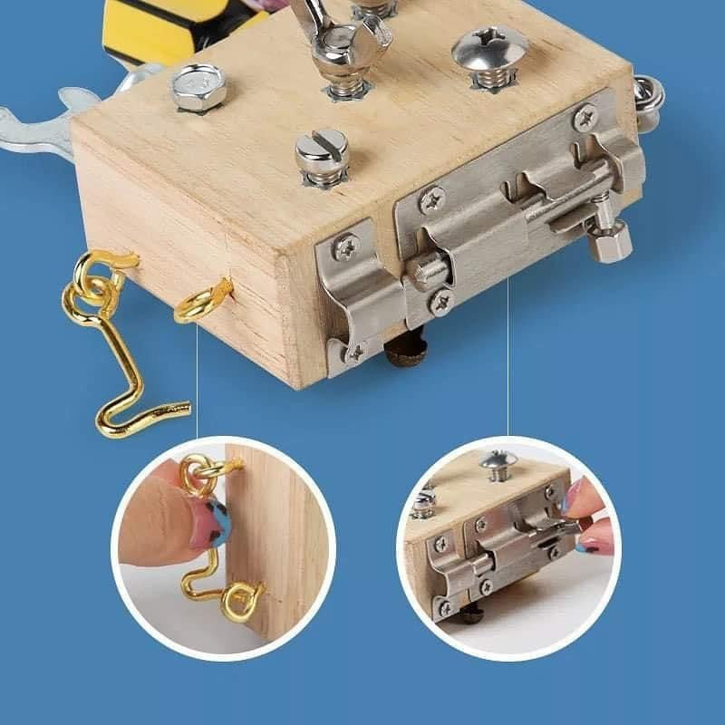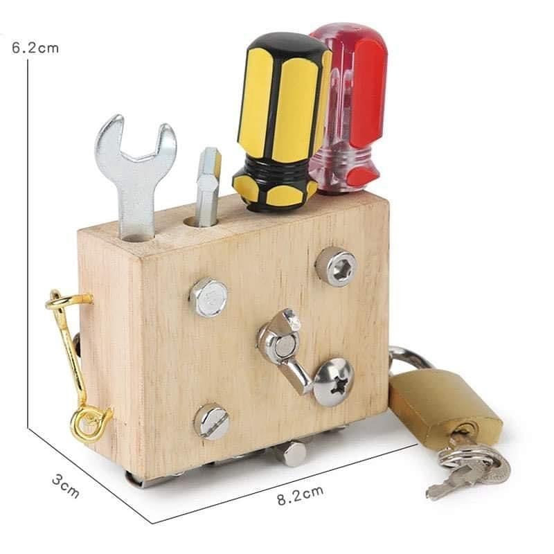 A Montessori csavarhuzós matató kocka remek fejlesztő játék a kicsik számára. Felszereltsége: reteszzárral, viharkampóval, lakattal, csavarokkal, amik segítenek a finommotorikus készség, kézügyesség és koncentráció fejlesztésében. Emellett kellemes szórakozást és hosszú időre leköti a figyelmüket.