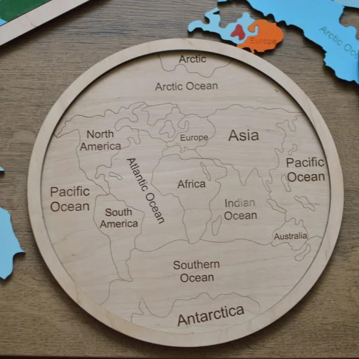 Montessori fa világ térkép kirakó – Kontinensek és óceánok tanuló játék