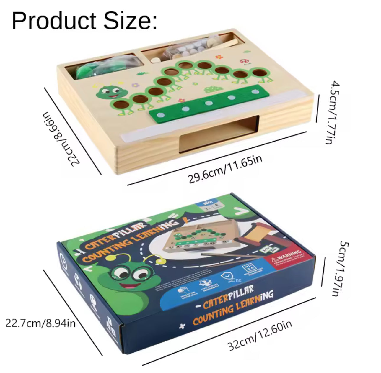 Montessori játék az összeadás és kivonás elsajátításához. A gyerekeknek a pálcikák segítségével kell a hernyocskára helyezni a megoldásnak megfelelő számú golyókat. Kiváló matematikai szemléltető és oktató játék.