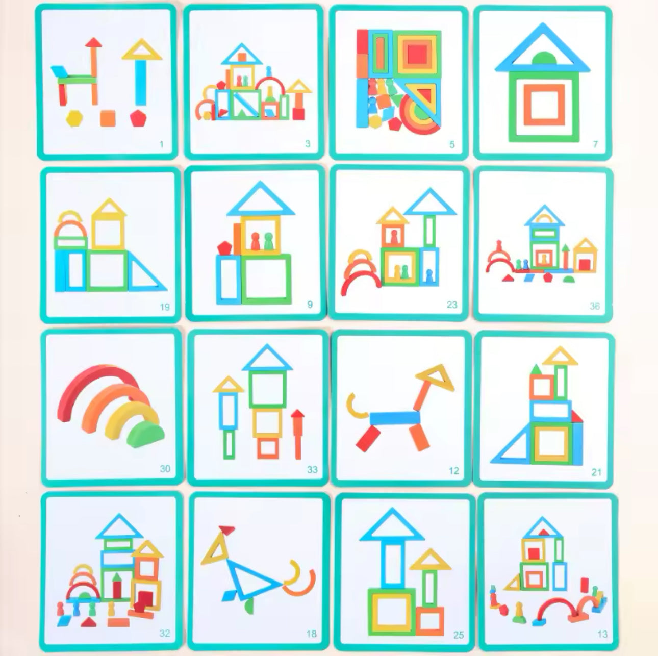 Kreatív blokkkészlet: Az egymásra rakható blokkkészletünk 26db színes geometrikus tömböt tartalmaz különböző formákban és 18db kétoldalas vezetőkártyát, kiválóan alkalmas gyerekeknek a formák, színek elsajátítására, valamint a gyerekek fantáziájának és kreativitásának serkentésére.