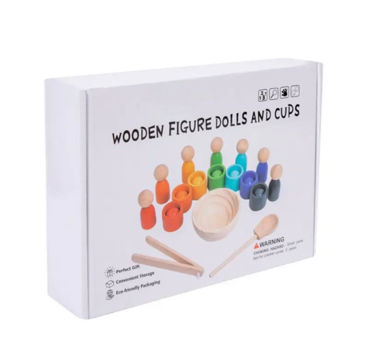 Montessori játék 7 különböző színű bábúval, golyóval és pohárkákkal. A játékhoz tartozik egy csipesz és egy kanál is amellyekkel a megfelelő színű pohárkába helyezhetjük a bábukat, vagy golyókat. Fejleszti a finommotorikus készséget, kézügyességet, koncentrációt, segíti a színek elsajátítását.