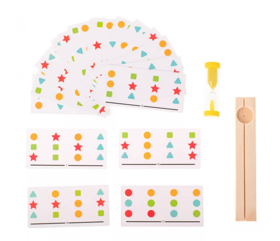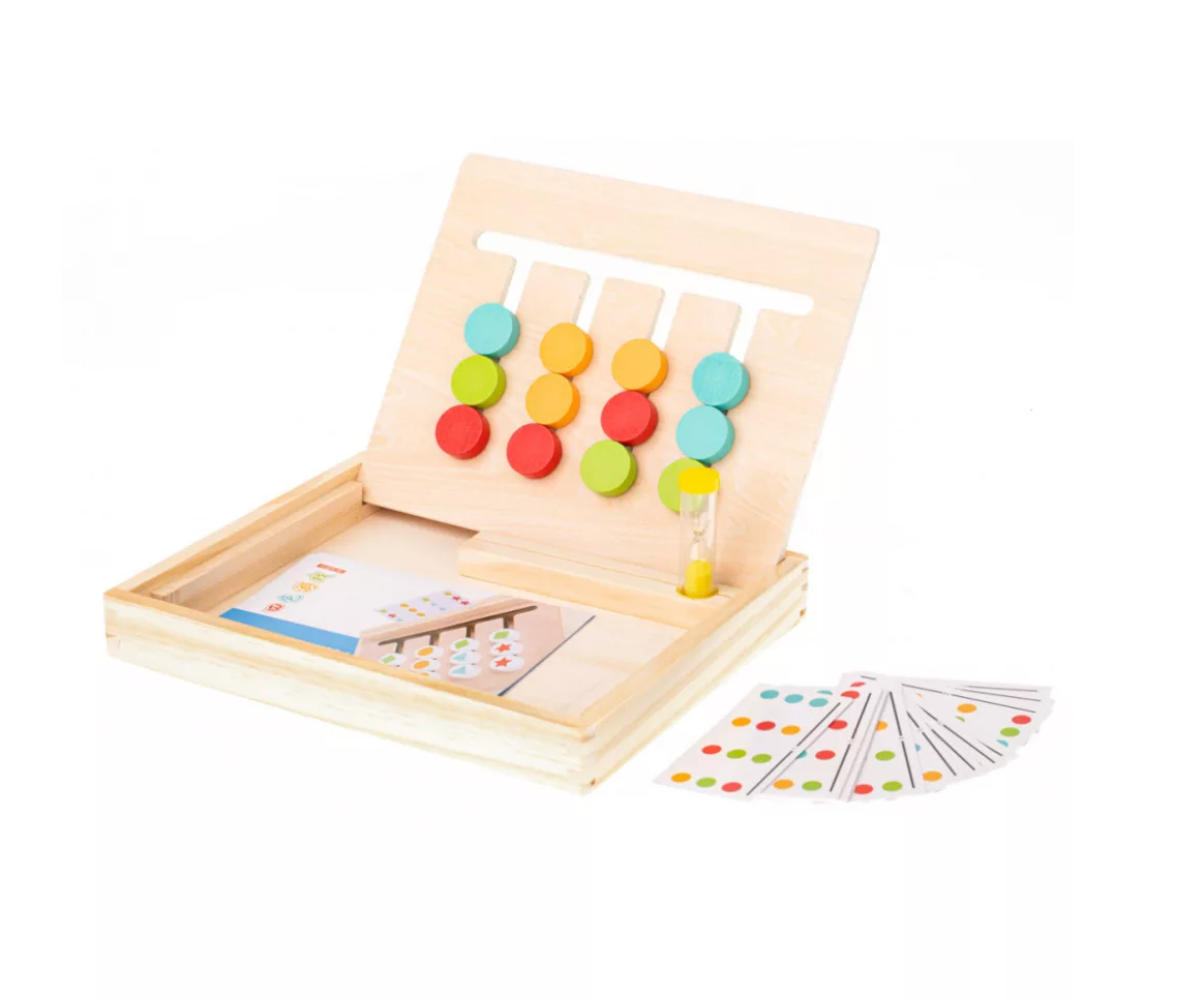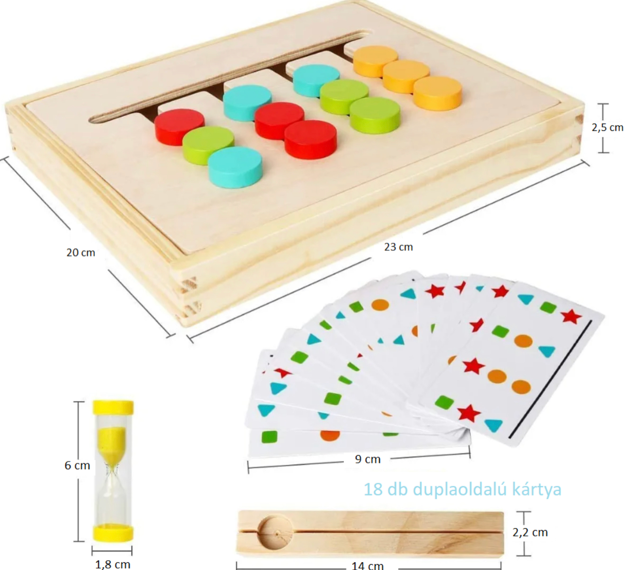 Ez a Montessori kétoldalas logikai játék szórakoztató és oktató eszköz, amely segít a gyerekeknek megtanulni a színeket, formákat és a logikus gondolkodást. A fa játéktábla egyik oldalán színes gombok találhatók a színek felismeréséhez, a másik oldalon pedig formák a geometriai minták tanulásához. A készlet tartalmaz kétoldalas puzzle kártyákat, homokórát és fa kártyatartót az interaktív játékhoz. Fejleszti a koncentrációt, finommotorikát és problémamegoldó készségeket, 4 éves kortól ajánlott.