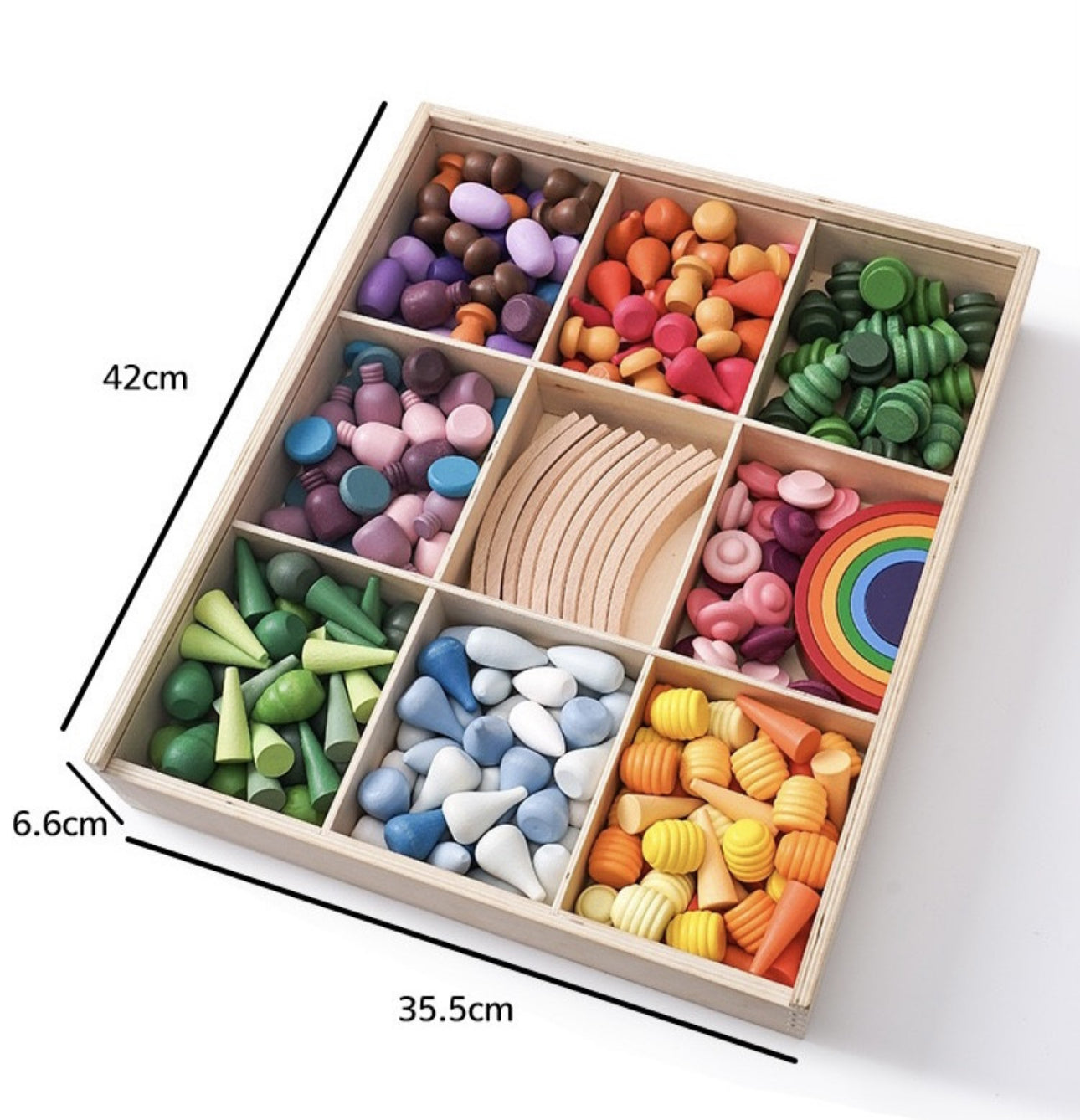 Ez a nyílt végű játék gyönyörű, különböző formájú és színű fa elemeket tartalmaz, amelyekkel a gyerekek szabadon építhetnek, szortírozhatnak és alkothatnak.