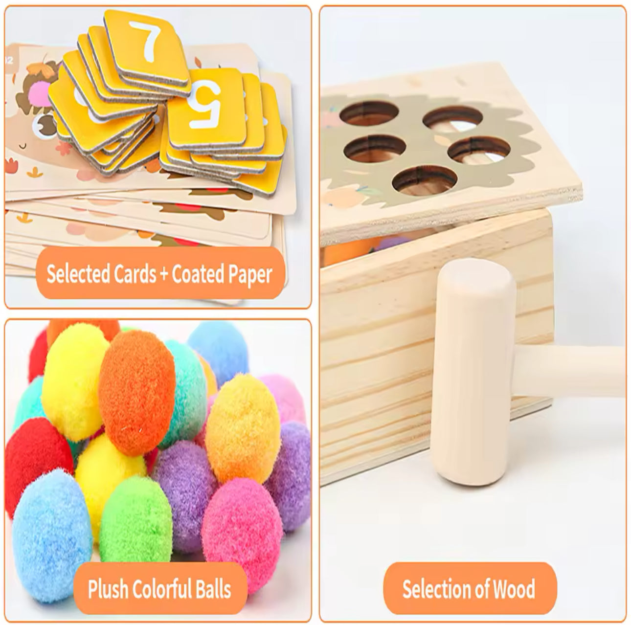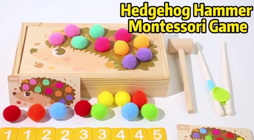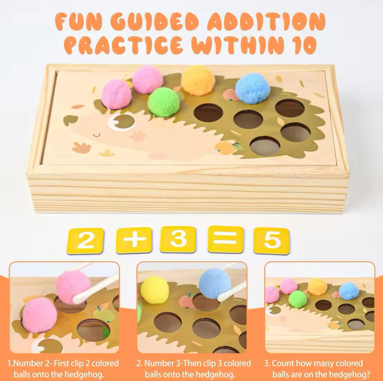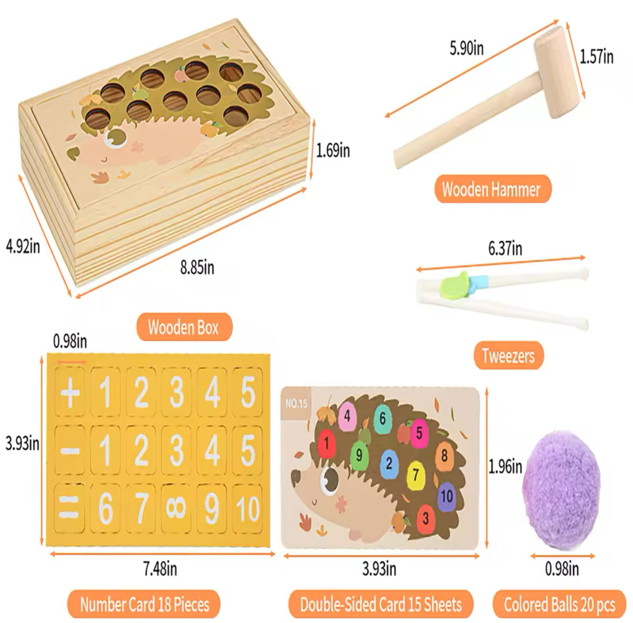 A játék 15 db feladatkártyát tartalmaz, melyeknek megfelelően kell a labdákat a sünire helyezni a csipesz segítségével, majd bele kalapálni. Emellett összeadás és kivonás tanulasára is alkalmas.