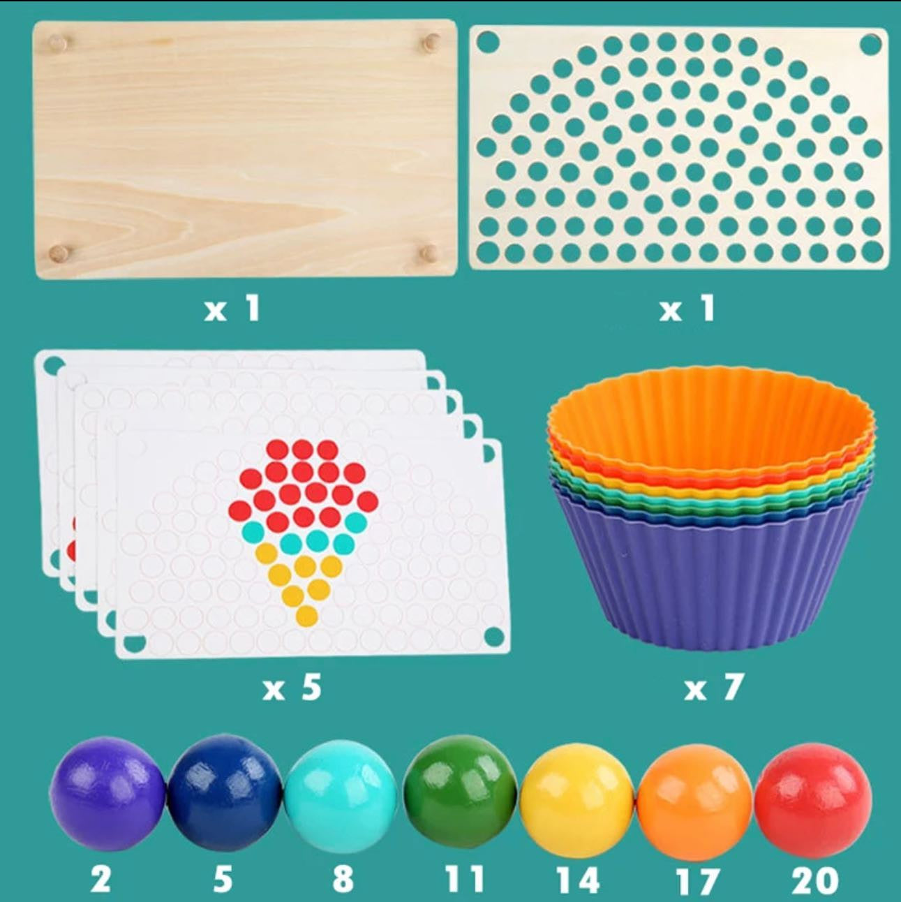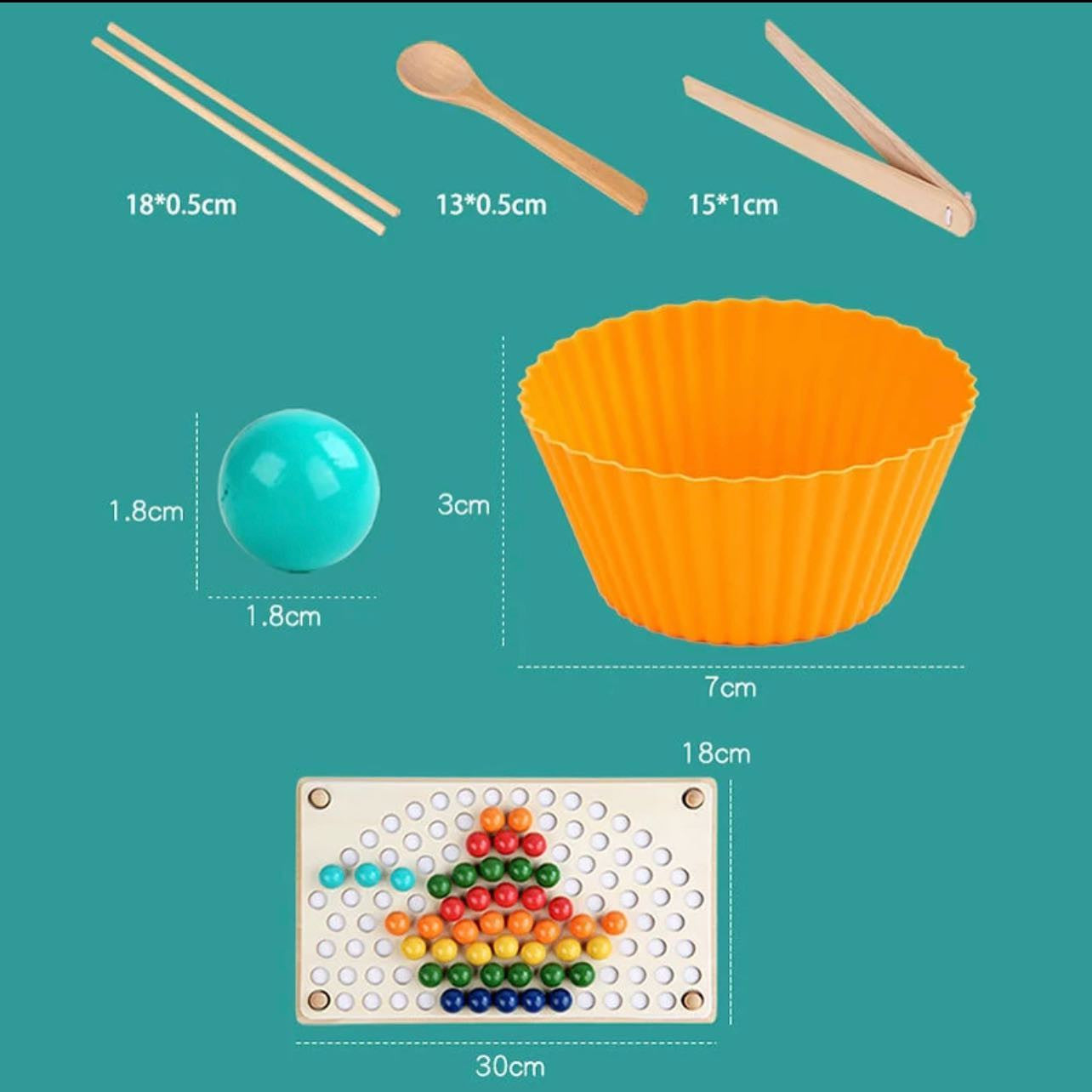 Koncentrációt fejlesztő színválogató játék feladatlapokkal, kanállal, csipesszel, válogatótálakkal, hét különböző színű golyóval.