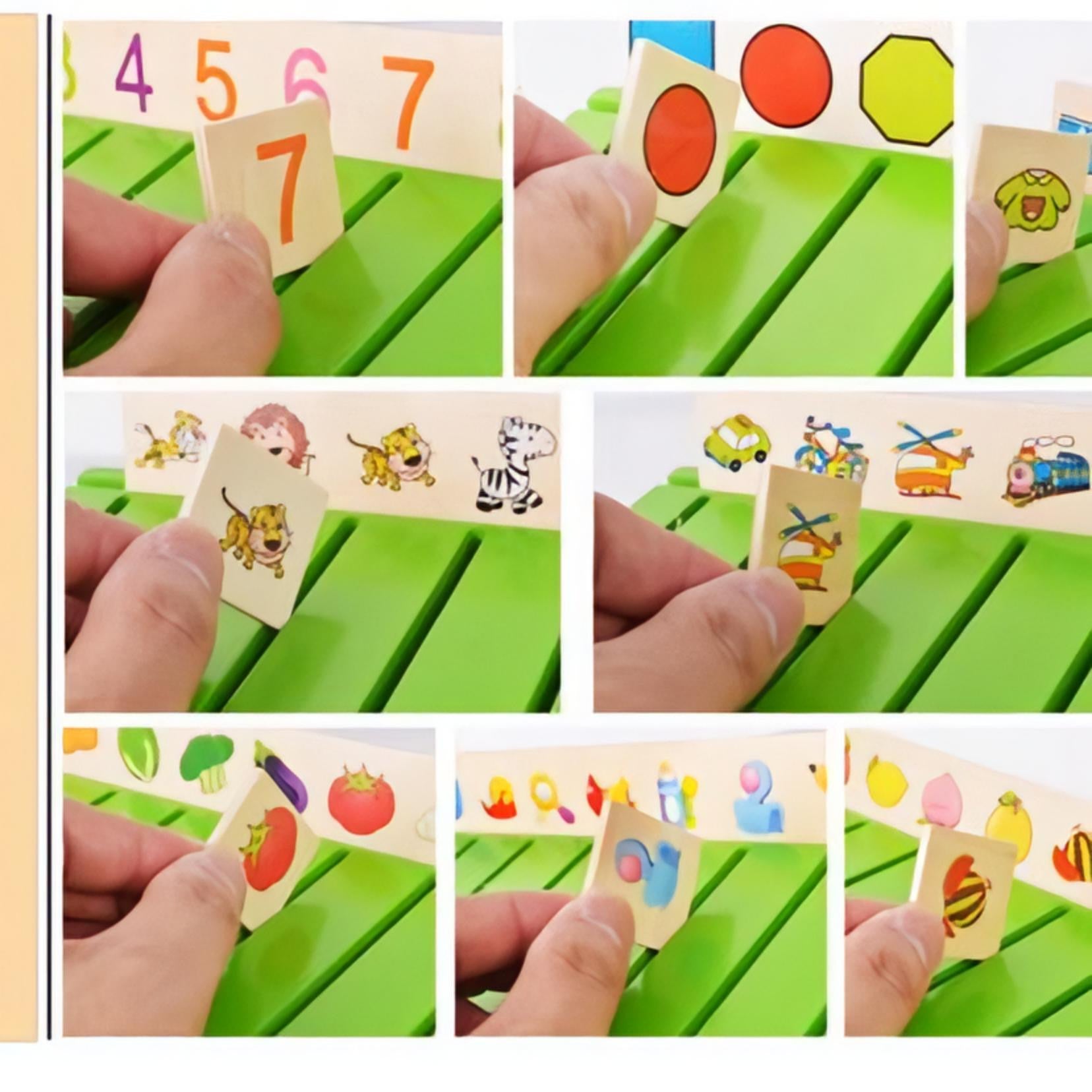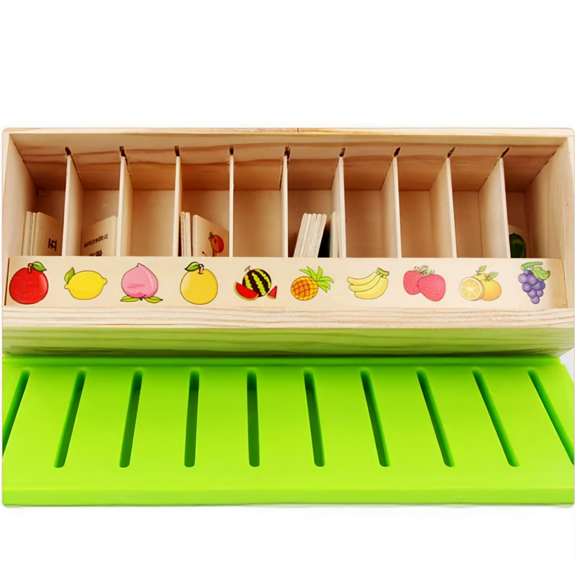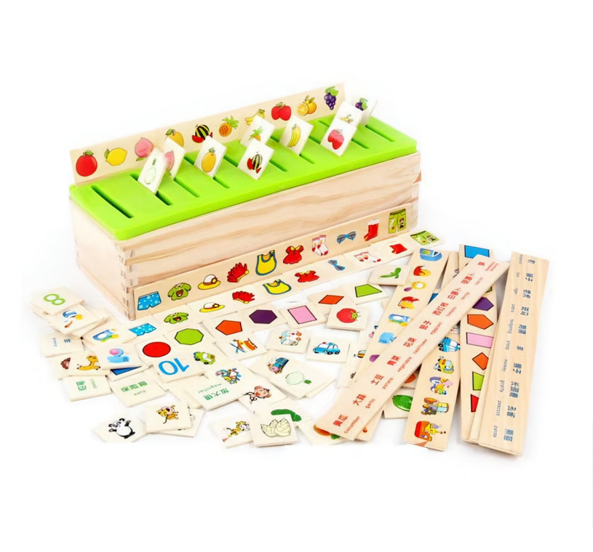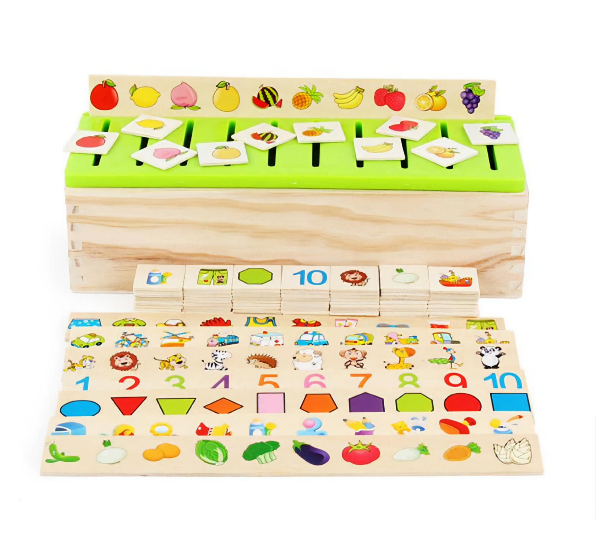 A játék segítségével a gyerekek megtanulják a különböző geometriai formákat, számokat, ruhaneműket, zöldségeket, tárgyakat, állatokat, gyümölcsöket és ezen csoportok megkülönböztetését. Játékszabály: a szortírozó doboz tetejére helyezett feladatlapocskákon lévő ábrákat kell kikeresni és a megfelelő résbe bedobni.
