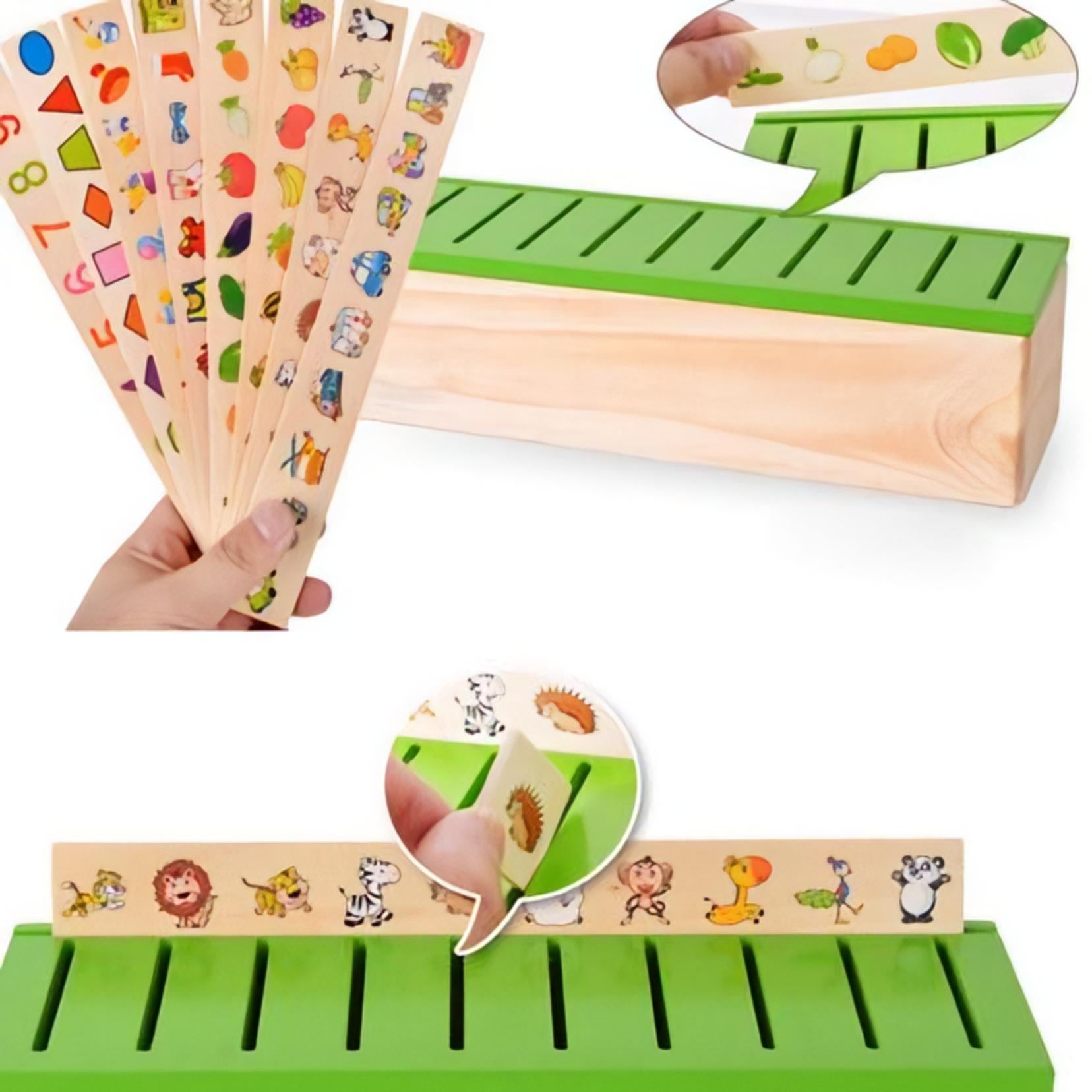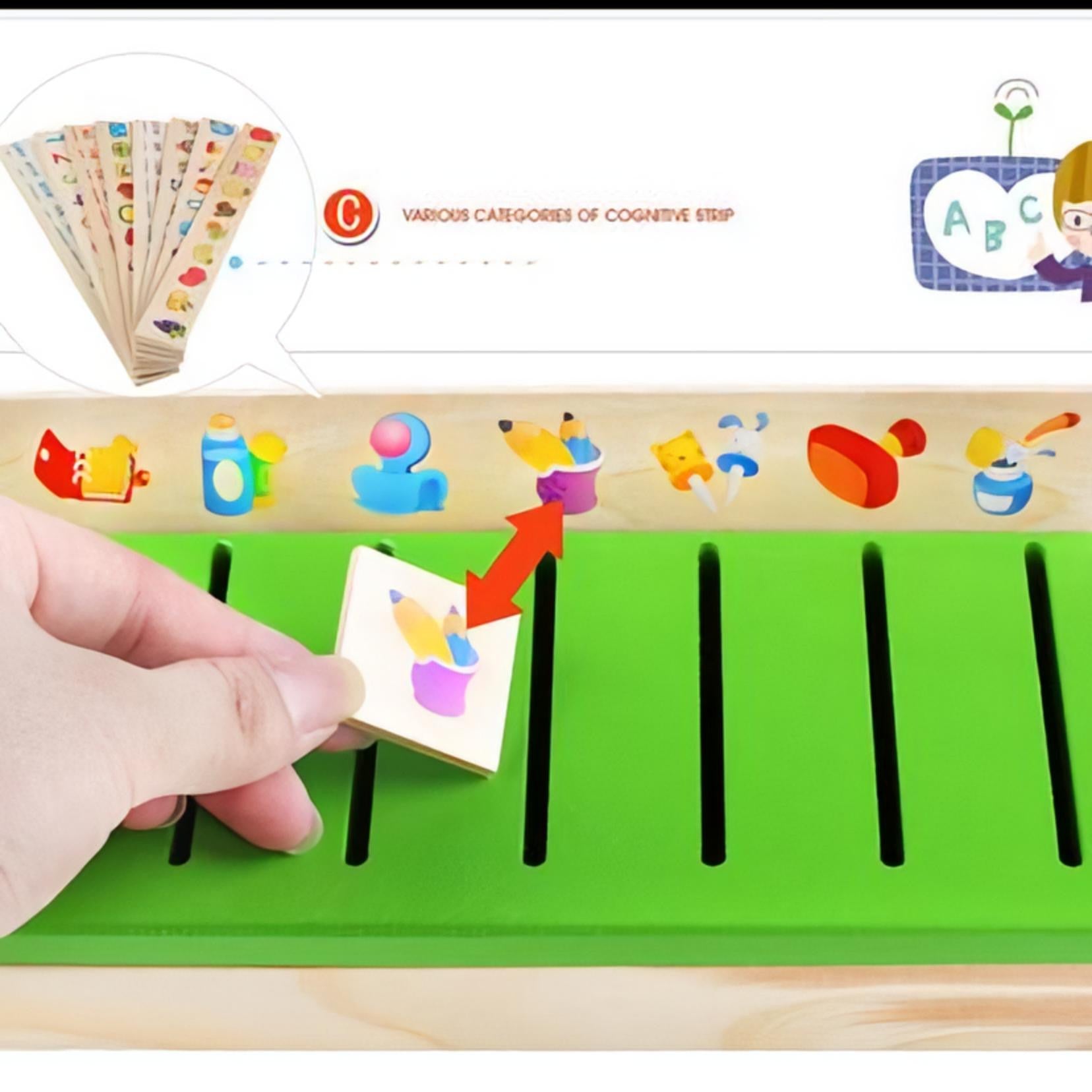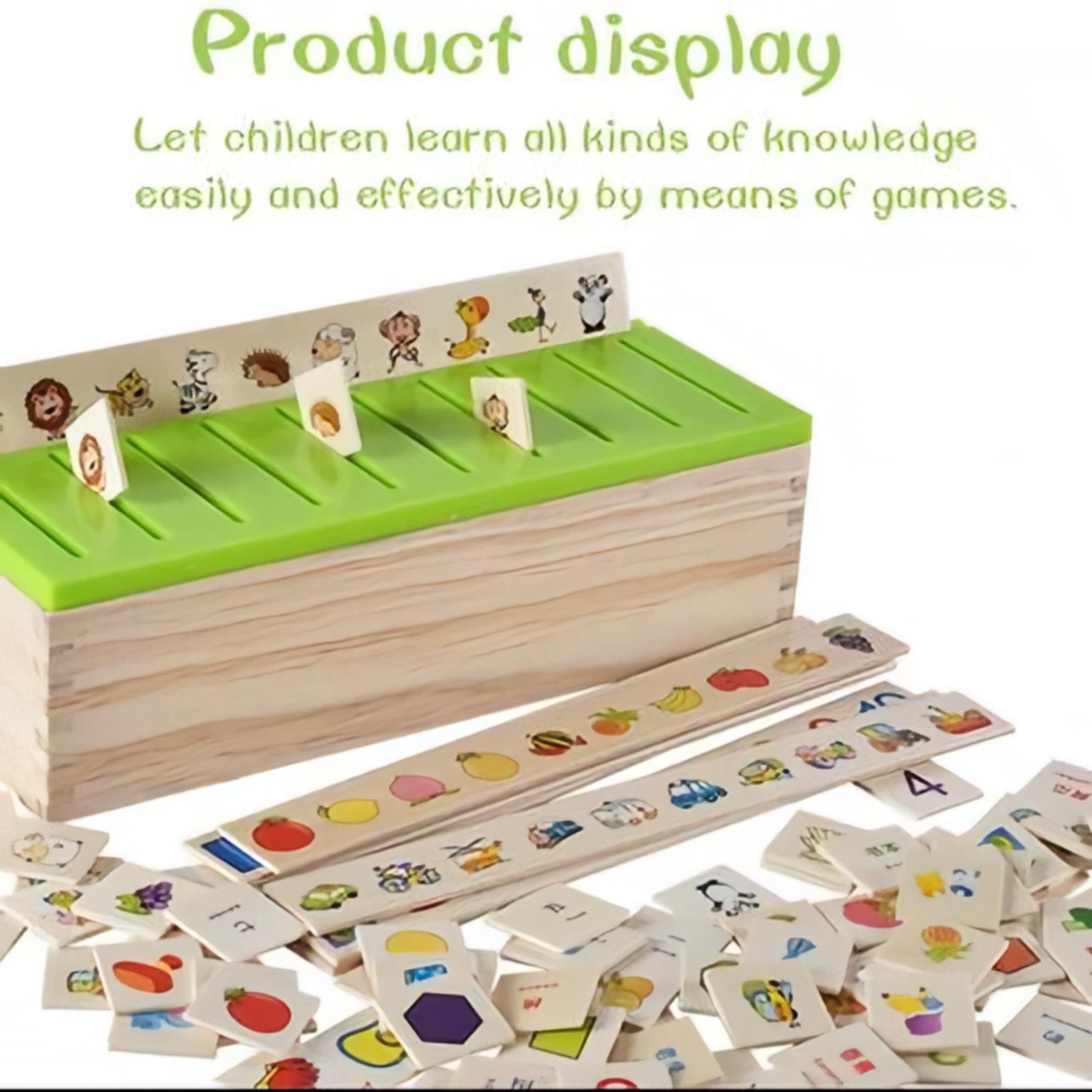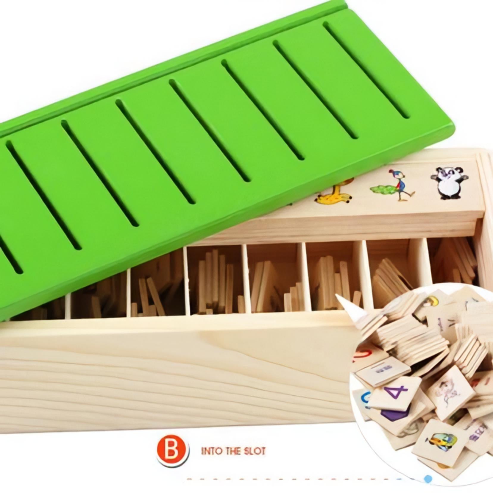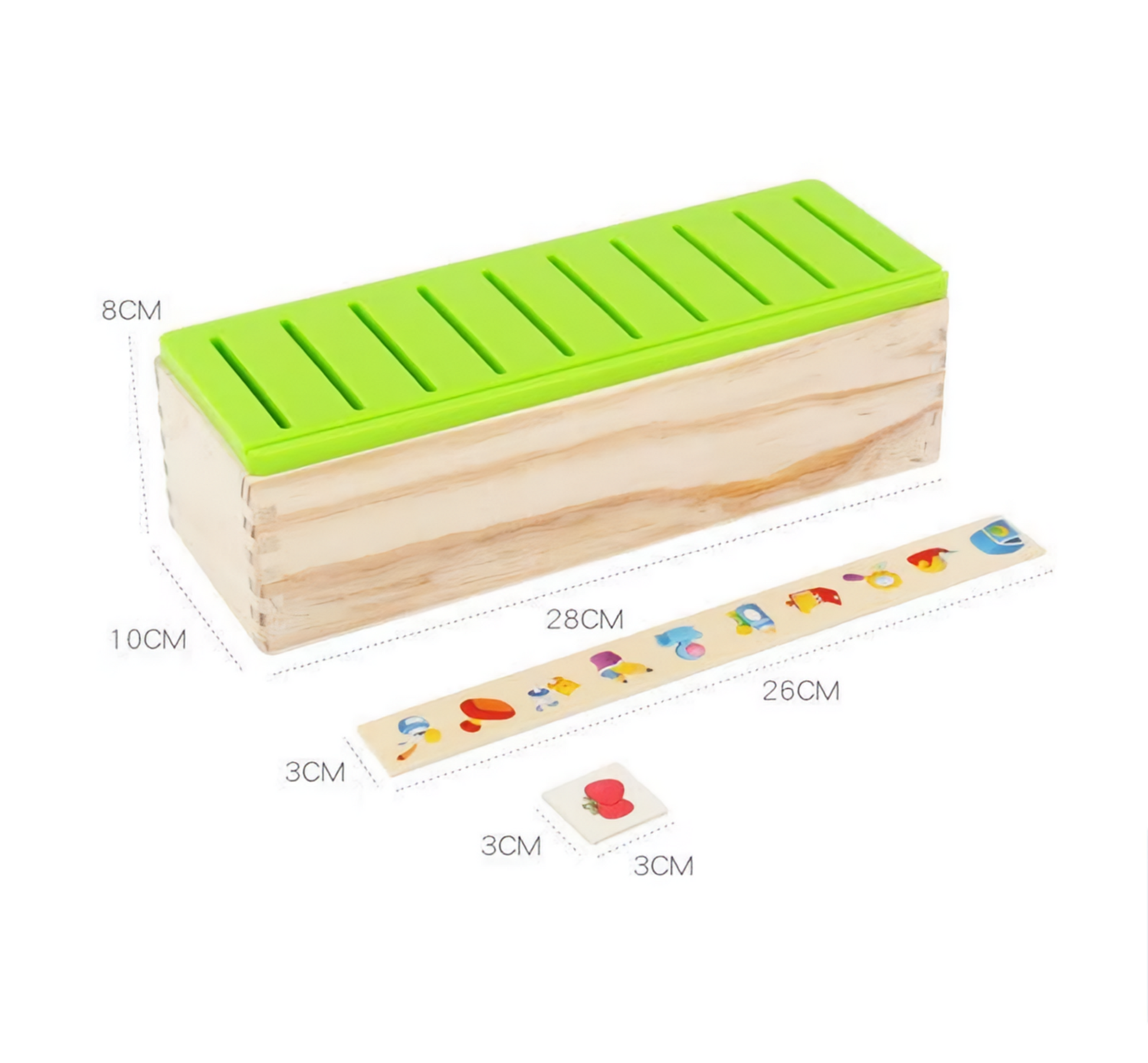 A játék segítségével a gyerekek megtanulják a különböző geometriai formákat, számokat, ruhaneműket, zöldségeket, tárgyakat, állatokat, gyümölcsöket és ezen csoportok megkülönböztetését. Játékszabály: a szortírozó doboz tetejére helyezett feladatlapocskákon lévő ábrákat kell kikeresni és a megfelelő résbe bedobni.